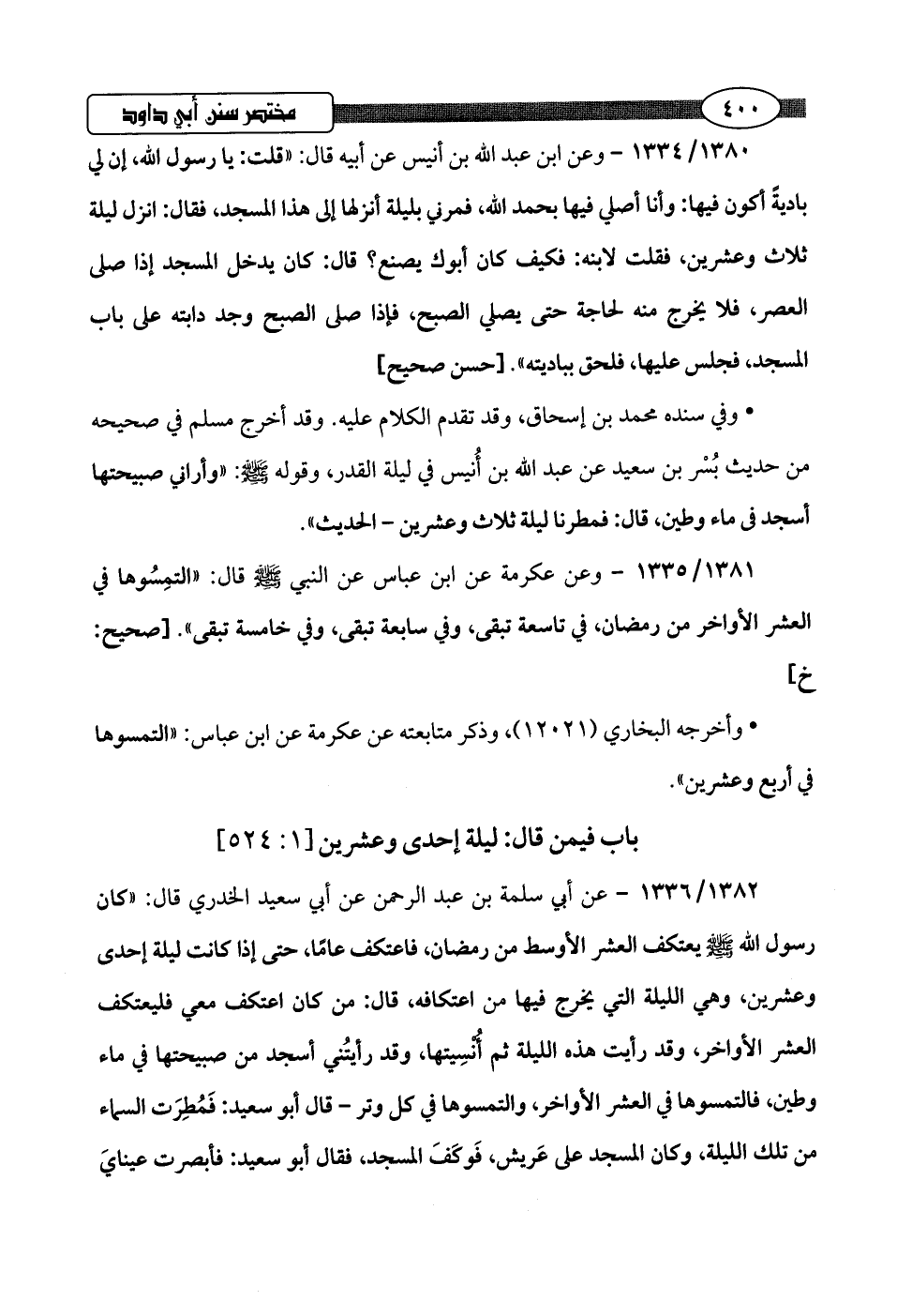 1380/ 1334 - وعن ابن عبد اللَّه بن أنيس عن أبيه قال: "قلت: يا رسول اللَّه، إن لي باديةً أكون فيها: وأنا أصلي فيها بحمد اللَّه، فمرني بليلة أنزلها إلى هذا المسجد، فقال: انزل ليلة ثلاث وعشرين، فقلت لابنه: فكيف كان أبوك يصنع؟ قال: كان يدخل المسجد إذا صلى العصر، فلا يخرج منه لحاجة حتى يصلي الصبح، فإذا صلى الصبح وجد دابته على باب المسجد، فجلس عليها، فلحق بباديته".hحسن صحيح]