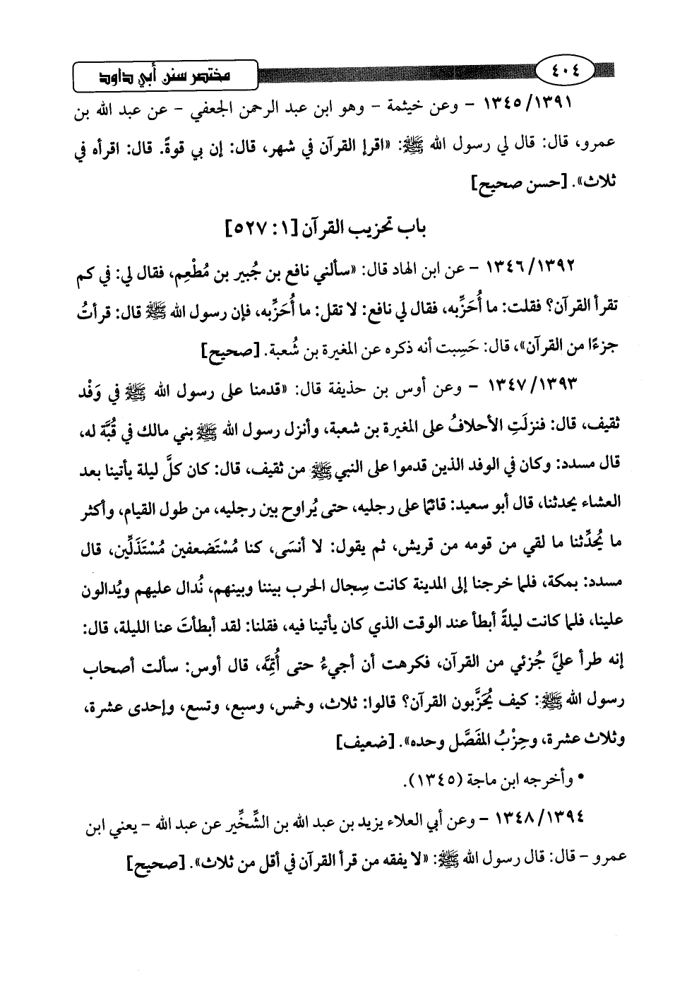 1394/ 1348 - وعن أبي العلاء يزيد بن عبد اللَّه بن الشِّخِّير عن عبد اللَّه -يعني ابن عمرو- قال: قال رسول اللَّه -صلى اللَّه عليه وسلم-: "لا يفقه من قرأ القرآن في أقل من ثلاث".hصحيح]