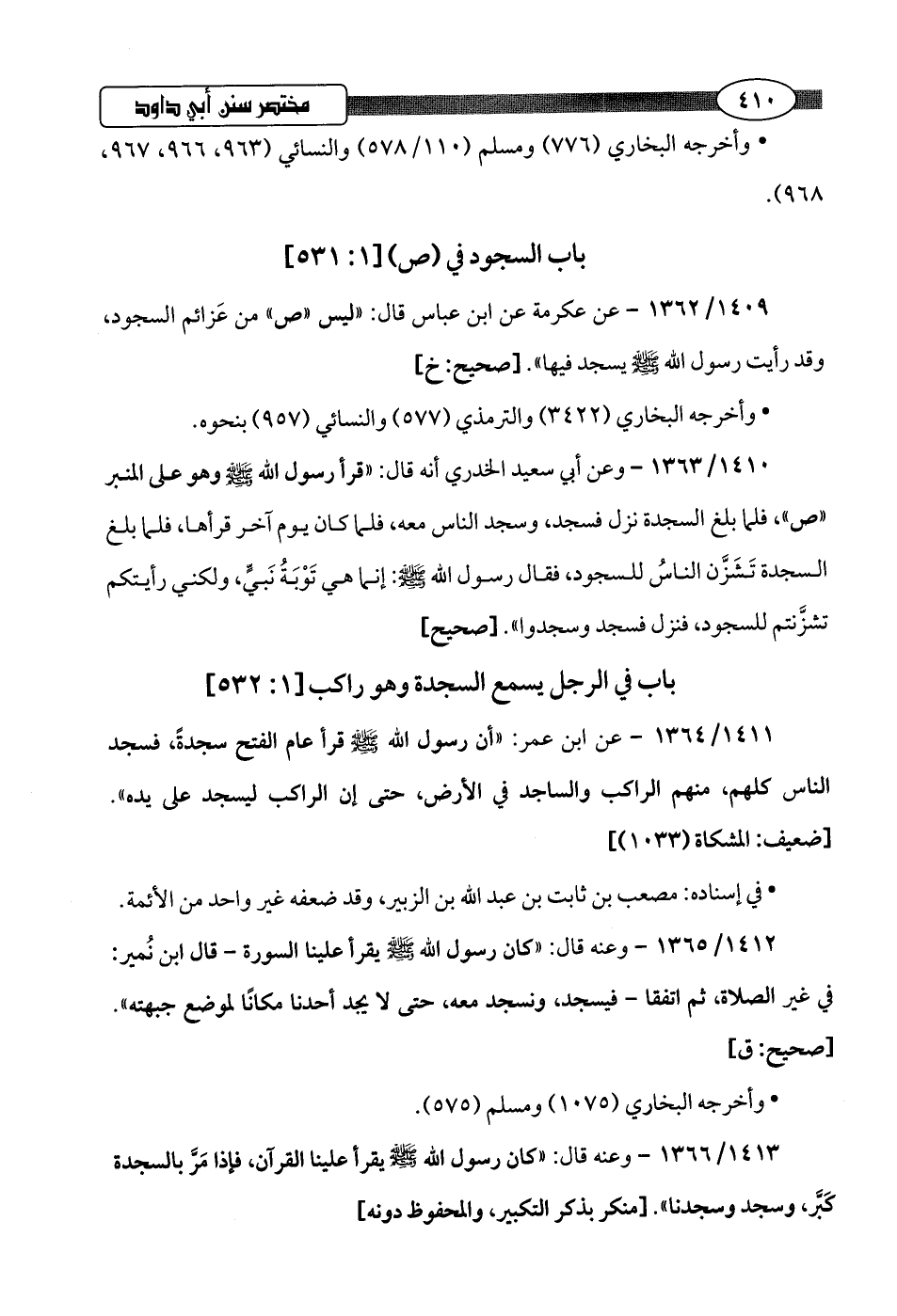 1409/ 1362 - عن عكرمة عن ابن عباس قال: "ليس "ص" من عَزائم السجود، وقد رأيت رسول اللَّه -صلى اللَّه عليه وسلم- يسجد فيها".hصحيح: خ]