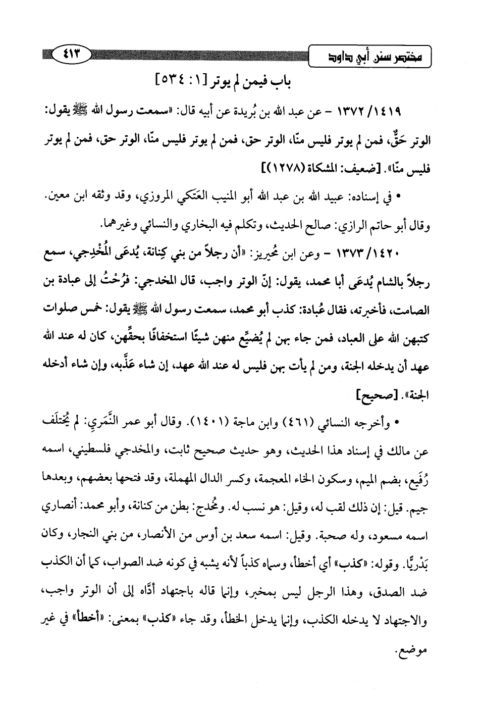 1420/ 1373 - وعن ابن مُحيريز: "أن رجلًا من بني كِنانة، يُدعَى المُخْدِجي، سمع رجلًا بالشام يُدعَى أبا محمد، يقول: إنّ الوتر واجب، قال المخدجي: فرُحْتُ إلى عبادة بن الصامت، فأخبرته، فقال عُبادة: كذب أبو محمد، سمعت رسول اللَّه -صلى اللَّه عليه وسلم- يقول: خمس صلوات كتبهن اللَّه على العباد، فمن جاء بهن لم يُضيِّع منهن شيئًا استخفافًا بحقِّهن، كان له عند اللَّه عهد أن يدخله الجنة، ومن لم يأت بهن فليس له عند اللَّه عهد، إن شاء عَذَّبه، وإن شاء أدخله الجنة".hصحيح]