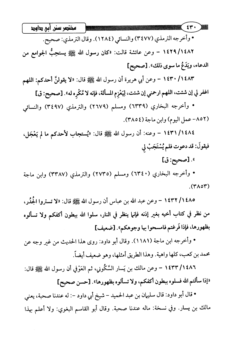 1486/ 1433 - وعن مالك بن يَسار السَّكُوني، ثم العَوْفي أن رسول اللَّه -صلى اللَّه عليه وسلم- قال: "إذا سألتم اللَّه فسلوه ببطون أكفكم، ولا تسألوه بظهورها".hحسن صحيح]
