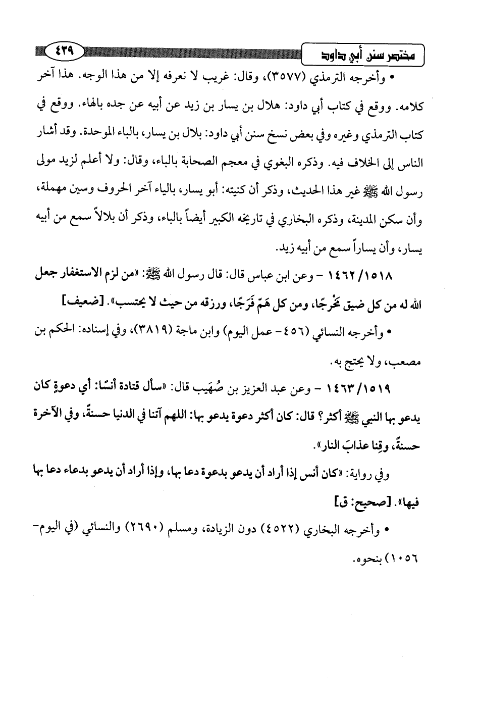 1518/ 1462 - وعن ابن عباس قال: قال رسول اللَّه -صلى اللَّه عليه وسلم-: "من لزم الاستغفار جعل اللَّه له من كل ضيق مَخْرجًا، ومن كل هَمّ فَرَجًا، ورزقه من حيث لا يحتسب".hضعيف]