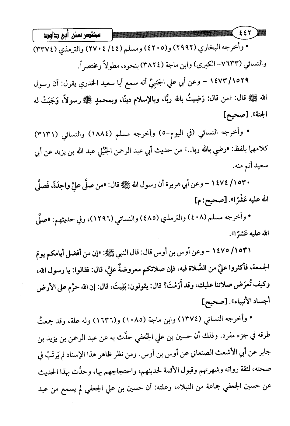 1529/ 1473 - وعن أبي علي الجَنبِيِّ أنه سمع أبا سعيد الخدري يقول: أن رسول اللَّه -صلى اللَّه عليه وسلم- قال: "من قال: رَضِيتُ باللَّه ربًّا، وبالإسلام دينًا، وبمحمدٍ -صلى اللَّه عليه وسلم- رسولًا، وَجَبَتْ له الجنة".hصحيح]