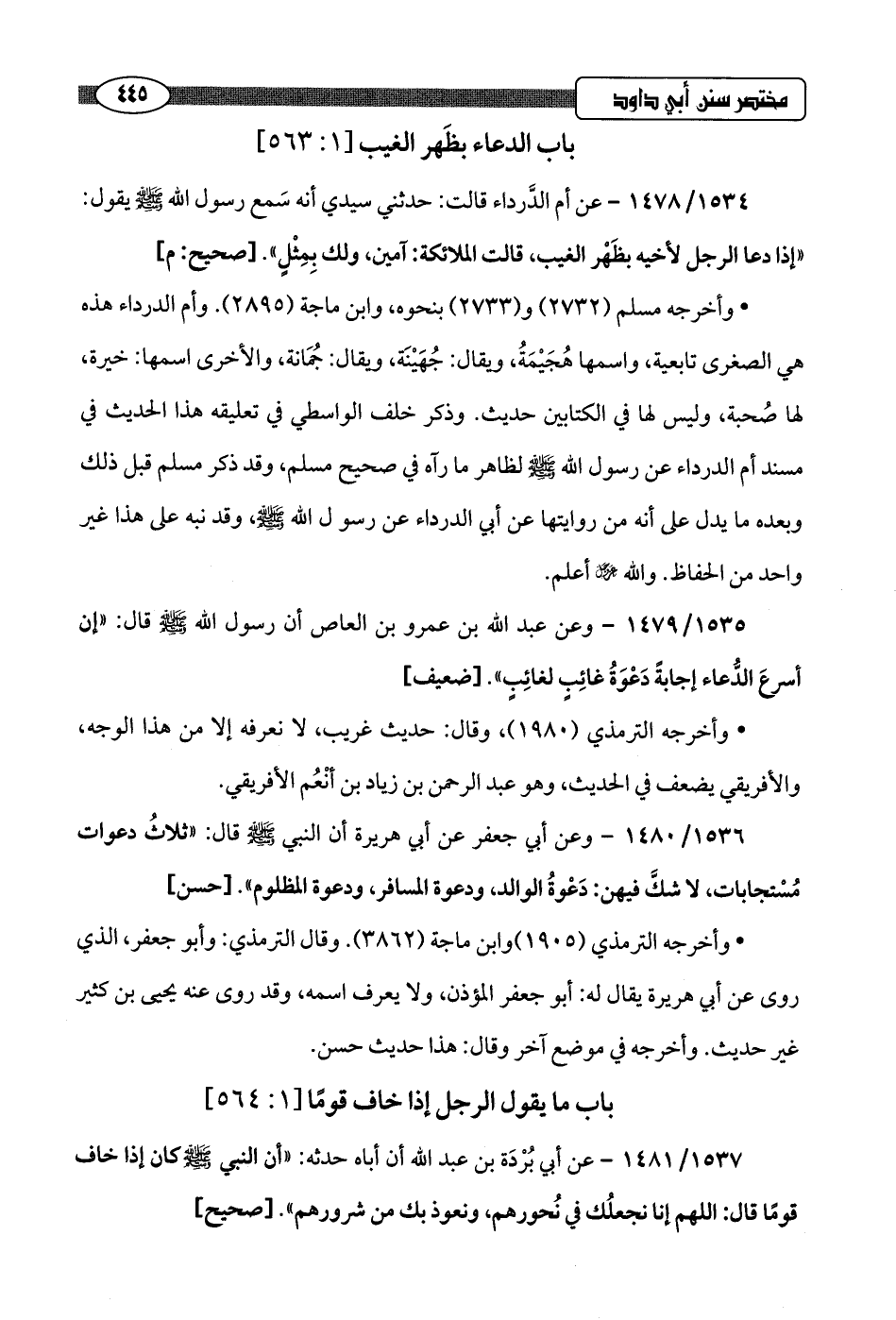 1535/ 1479 - وعن عبد اللَّه بن عمرو بن العاص أن رسول اللَّه -صلى اللَّه عليه وسلم- قال: "إن أسرعَ الدُّعاء إجابةً دَعْوَةُ غائِبٍ لغائِبٍ".hضعيف]