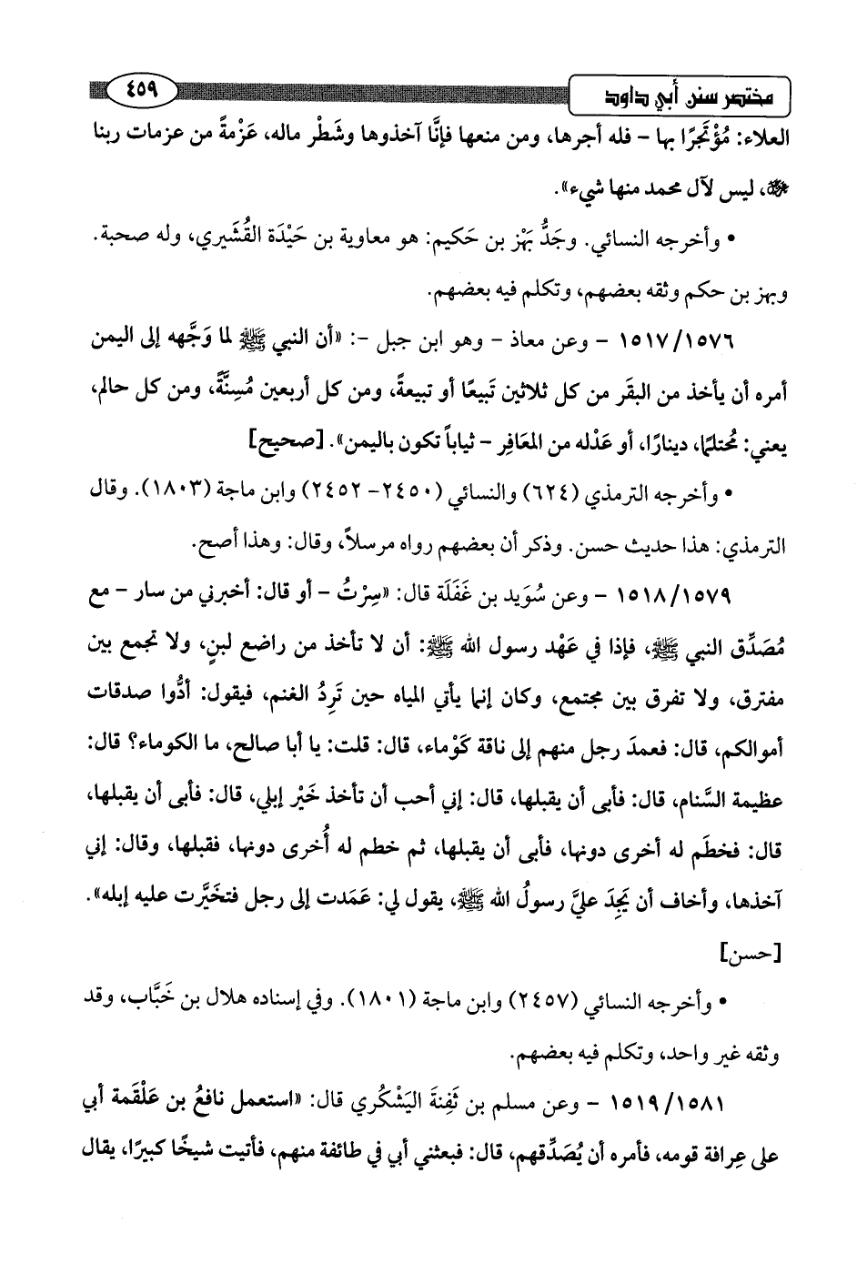 1579/ 1518 - وعن سُوَيد بن غَفَلَة قال: "سِرْتُ -أو قال: أخبرني من سار- مع مُصَدِّق النبي -صلى اللَّه عليه وسلم-، فإذا في عَهْد رسول اللَّه -صلى اللَّه عليه وسلم-: أن لا تأخذ من راضع لبنٍ، ولا تجمع بين مفترق، ولا تفرق بين مجتمع، وكان إنما يأتي المياه حين تَرِدُ الغنم، فيقول: أدُّوا صدقات أموالكم، قال: فعمدَ رجل منهم إلى ناقة كَوْماء، قال: قلت: يا أبا صالح، ما الكوماء؟ قال: عظيمة السَّنام، قال: فأبى أن يقبلها، قال: إني أحب أن تأخذ خَيْر إبلي، قال: فأبى أن يقبلها، قال: فخطَم له أخرى دونها، فأبى أن يقبلها، ثم خطم له أُخرى دونها، فقبلها، وقال: إني آخذها، وأخاف أن يَجِدَ عليَّ رسولُ اللَّه -صلى اللَّه عليه وسلم-، يقول لي: عَمَدت إلى رجل فتخَيَّرت عليه إبله".hحسن]