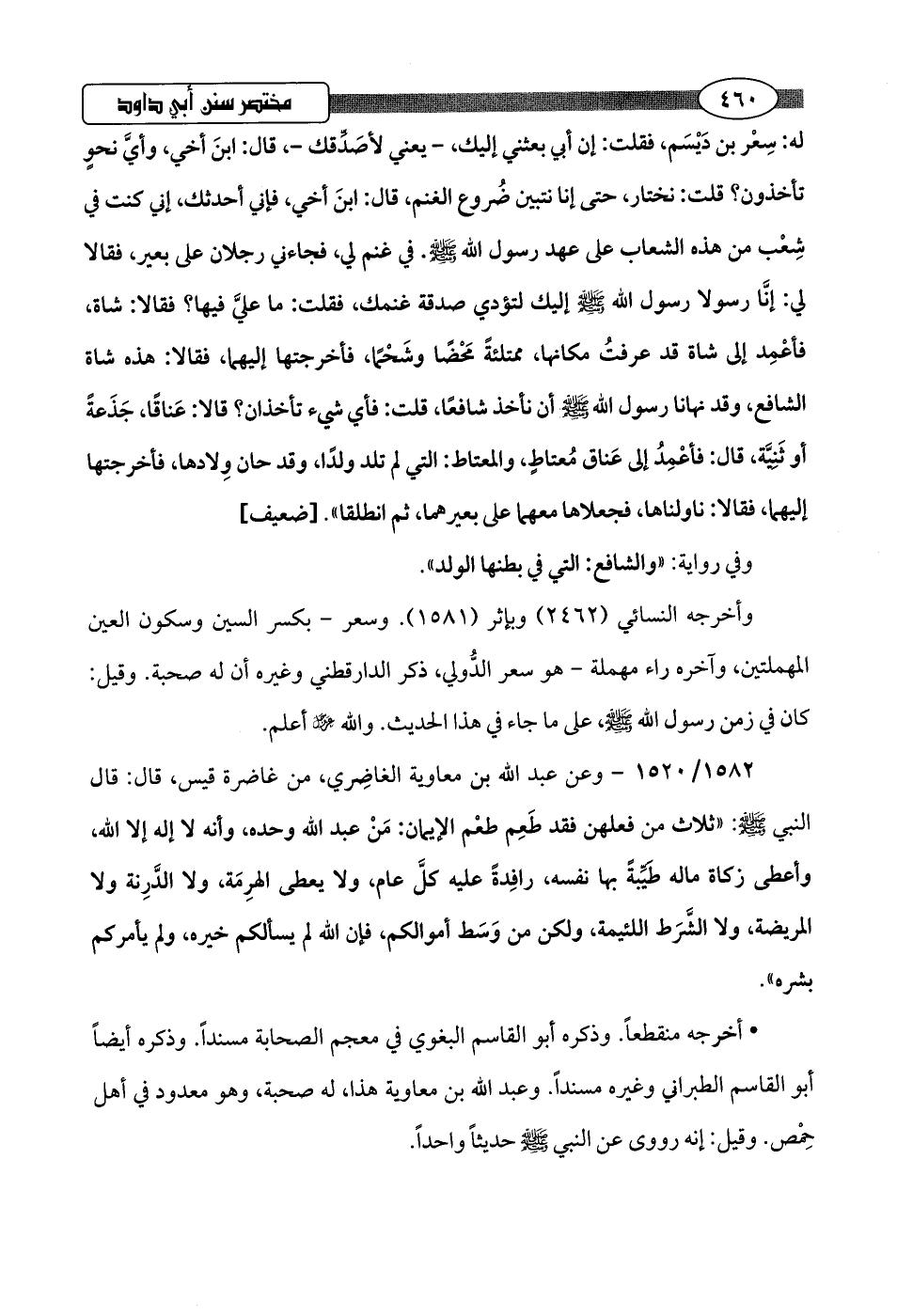 له: سِعْر بن دَيْسَم، فقلت: إن أبي بعثني إليك، -يعني لأصَدِّقك-، قال: ابنَ أخي، وأيَّ نحوٍ تأخذون؟ قلت: نختار، حتى إنا نتبين ضُروع الغنم، قال: ابنَ أخي، فإني أحدثك، إني كنت في شِعْب من هذه الشعاب على عهد رسول اللَّه -صلى اللَّه عليه وسلم-. في غنم لي، فجاءني رجلان على بعير، فقالا لي: إنَّا رسولا رسول اللَّه -صلى اللَّه عليه وسلم- إليك لتؤدي صدقة غنمك، فقلت: ما عليَّ فيها؟ فقالا: شاة، فأعْمِد إلى شاة قد عرفتُ مكانها، ممتلئةً مَحْضًا وشَحْمًا، فأخرجتها إليهما، فقالا: هذه شاة الشافع، وقد نهانا رسول اللَّه -صلى اللَّه عليه وسلم- أن نأخذ شافعًا، قلت: فأي شيء تأخذان؟ قالا: عَناقًا، جَذَعةً أو ثَنِيَّة، قال: فأعْمِدُ إلى عَناق مُعتاطٍ، والمعتاط: التي لم تلد ولدًا، وقد حان وِلادها، فأخرجتها إليهما، فقالا: ناولناها، فجعلاها معهما على بعير هما، ثم انطلقا".hضعيف]