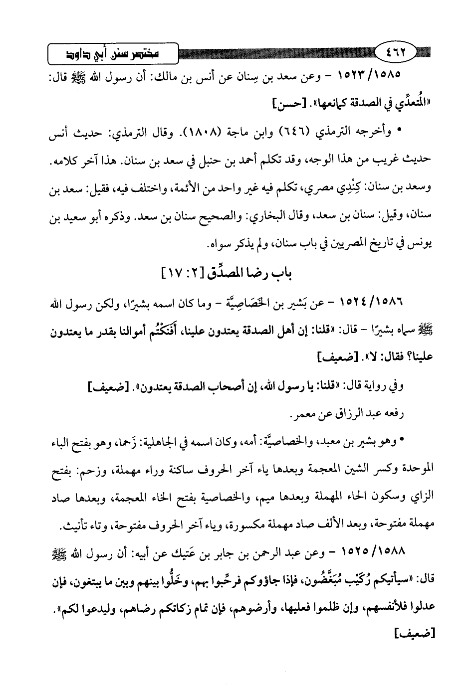 1586/ 1524 - عن بَشير بن الخَصَاصِيَّة -وما كان اسمه بشيرًا، ولكن رسول اللَّه -صلى اللَّه عليه وسلم- سماه بشيرًا- قال: "قلنا: إن أهل الصدقة يعتدون علينا، أَفَنَكْتُم أموالنا بقدر ما يعتدون علينا؟ فقال: لا".hضعيف]