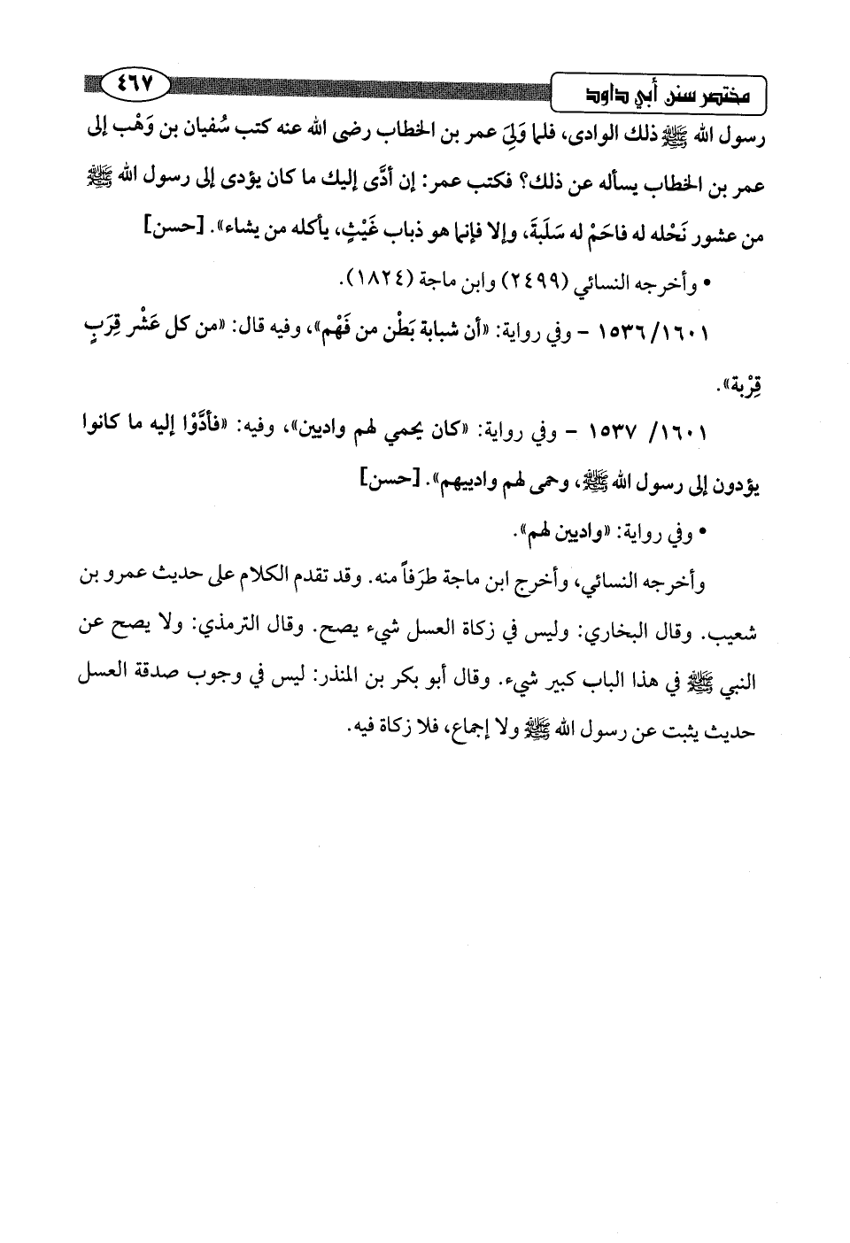 1601/ 1537 - وفي رواية: "كان يحمي لهم واديين"، وفيه: "فأدَّوْا إليه ما كانوا يؤدون إلى رسول اللَّه -صلى اللَّه عليه وسلم-، وحمى لهم وادييهم".hحسن]
