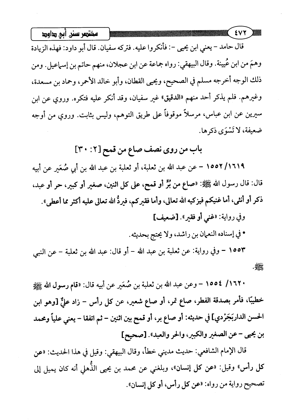 1625/ 1554 - وعن عبد اللَّه بن ثعلبة بن صُعَير عن أبيه قال: "قام رسول اللَّه -صلى اللَّه عليه وسلم- خطيبًا، فأمر بصدقة الفطر، صاع تمر، أو صاع شعير، عن كل رأس -زاد عليٌّ [وهو ابن الحسن الداربَجَرْدي] في حديثه: أو صاع بر، أو قمح بين اثنين -ثم اتفقا -يعني عليًا ومحمد بن يحيى- عن الصغير والكبير، والحر والعبد".hصحيح]