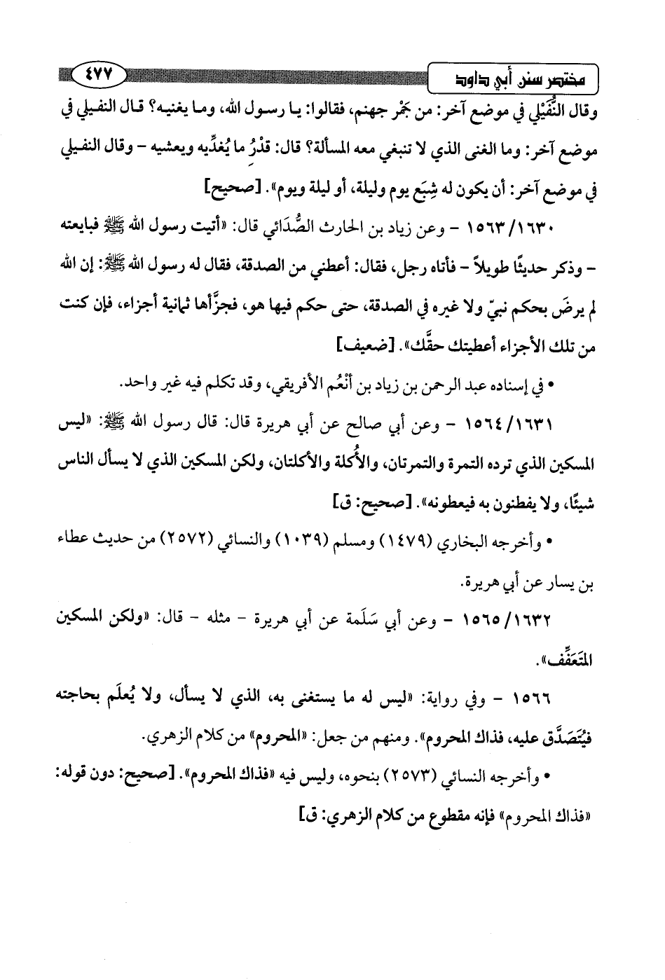 1566 - وفي رواية: "ليس له ما يستغنى به، الذي لا يسأل، ولا يُعلَم بحاجته فيُتَصَدَّق عليه، فذاك المحروم". ومنهم من جعل: "المحروم" من كلام الزهري.