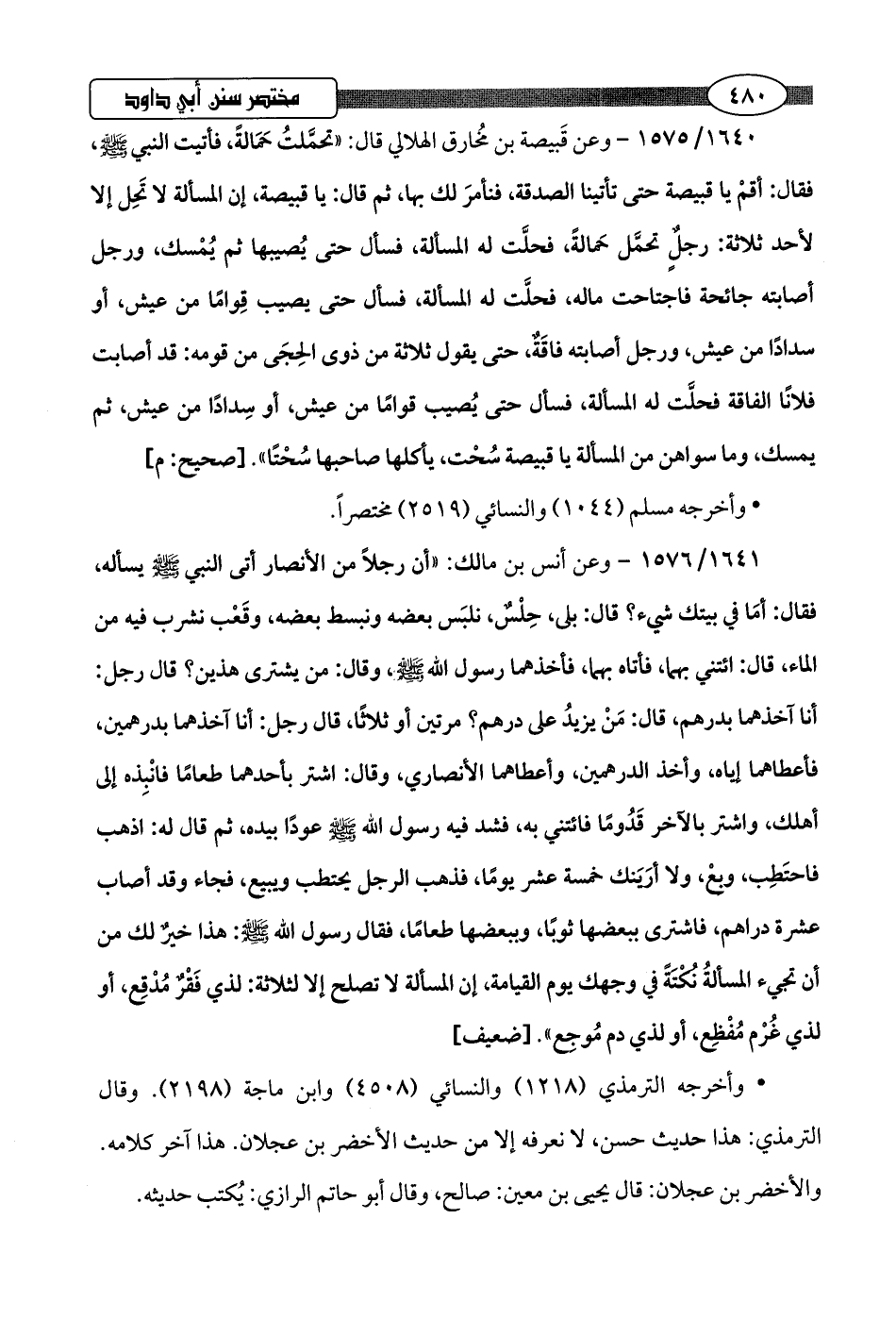 1640/ 1575 - وعن قَبيصة بن مخُارق الهلالي قال: "تحمَّلتُ حَمَالةً، فأتيت النبي -صلى اللَّه عليه وسلم-، فقال: أقمْ يا قبيصة حتى تأتينا الصدقة، فنأمرَ لك بها، ثم قال: يا قبيصة، إن المسألة لا تَحِل إلا لأحد ثلاثة: رجلٌ تحمَّل حَمالةً، فحلَّت له المسألة، فسأل حتى يُصيبها ثم يُمْسك، ورجل أصابته جائحة فاجتاحت ماله، فحلَّت له المسألة، فسأل حتى يصيب قِوامًا من عيش، أو سدادًا من عيش، ورجل أصابته فاقَةٌ، حتى يقول ثلاثة من ذوى الحِجَى من قومه: قد أصابت فلانًا الفاقة فحلَّت له المسألة، فسأل حتى يُصيب قوامًا من عيش، أو سدادًا من عيش، ثم يمسك، وما سواهن من المسألة يا قبيصة سُحْت، يأكلها صاحبها سُحْتًا".hصحيح: م]