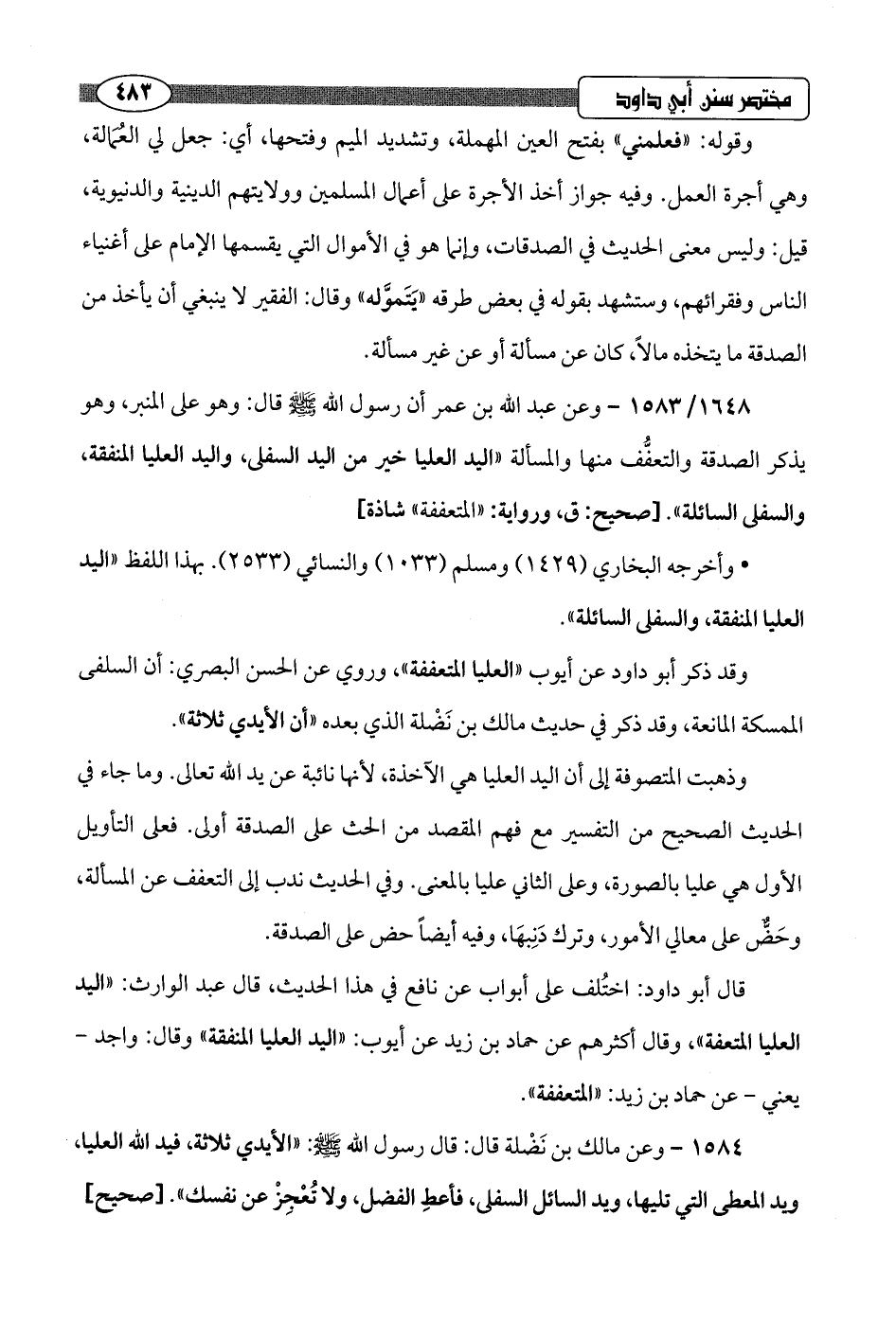 1648/ 1583 - وعن عبد اللَّه بن عمر أن رسول اللَّه -صلى اللَّه عليه وسلم- قال: وهو على المنبر، وهو يذكر الصدقة والتعفُّف منها والمسألة "اليد العليا خير من اليد السفلى، واليد العليا المنفقة، والسفلى السائلة".hصحيح: ق, ورواية: "المتعففة" شاذة]