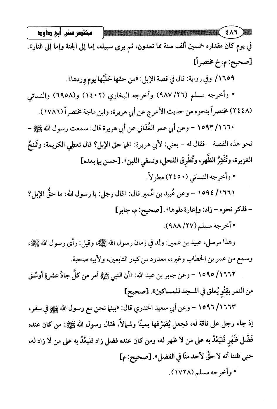 1660/ 1593 - وعن أبي عمر الغُدَاني عن أبي هريرة قال: سمعت رسول اللَّه -صلى اللَّه عليه وسلم- نحو هذه القصة- فقال له -يعني: لأبي هريرة: "فما حق الإبل؟ قال تعطي الكريمة، وتَمنحُ الغزيرة، وتُفْقِرُ الظَّهر، وتُطْرِق الفعل، وتسقي اللبن".hحسن بما بعده]