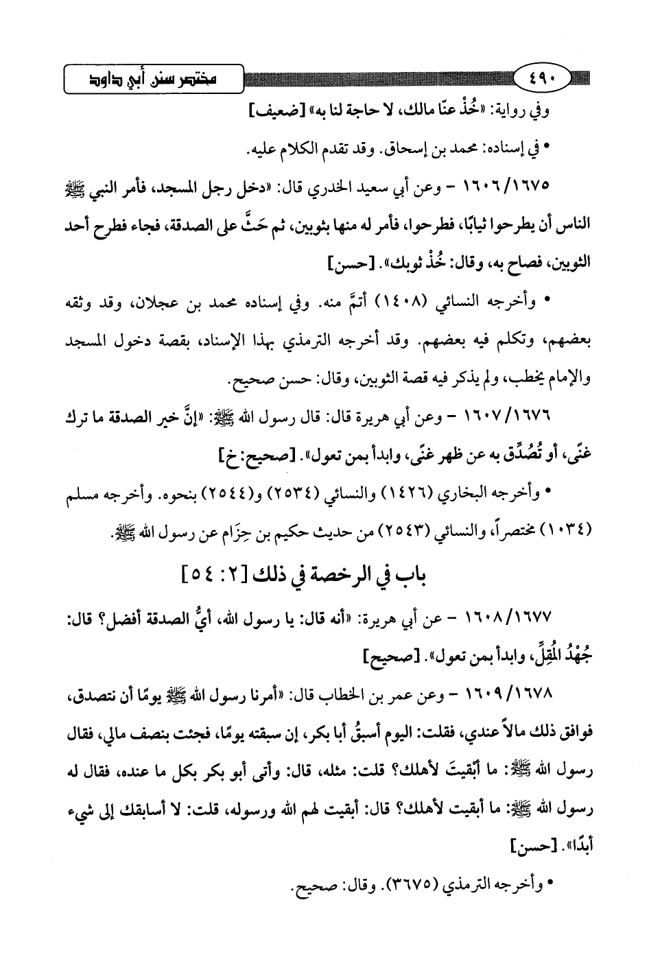 1675/ 1606 - وعن أبي سعيد الخدري قال: "دخل رجل المسجد، فأمر النبي -صلى اللَّه عليه وسلم- الناس أن يطرحوا ثيابًا، فطرحوا، فأمر له منها بثوبين، ثم حَثَّ على الصدقة، فجاء فطرح أحد الثوبين، فصاح به، وقال: خُذْ ثوبك".hحسن]