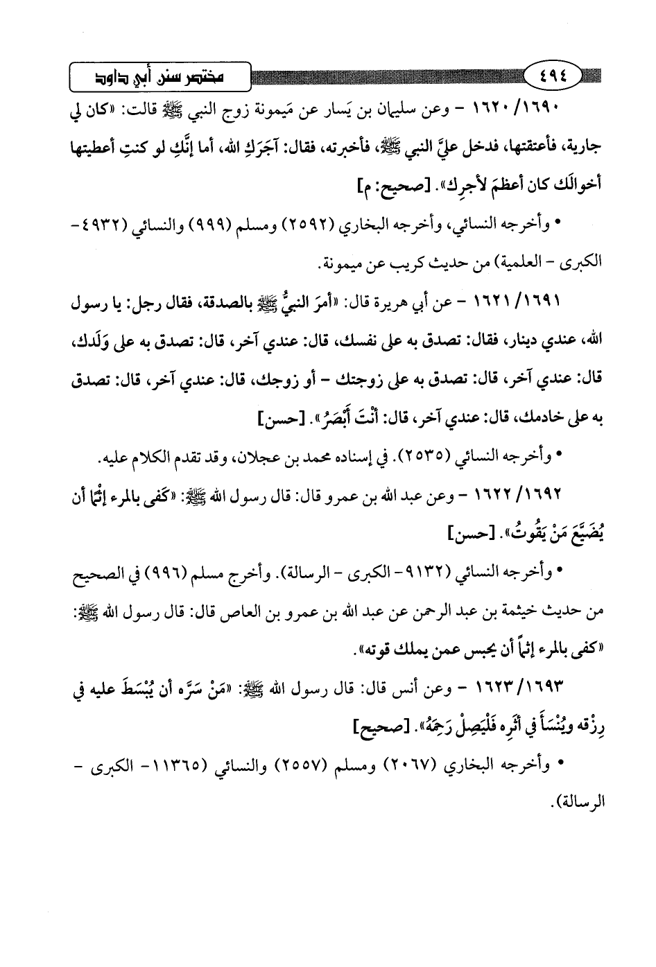 1690/ 1620 - وعن سليمان بن يَسار عن مَيمونة زوج النبي -صلى اللَّه عليه وسلم- قالت: "كان لي جارية، فأعتقتها، فدخل عليَّ النبي -صلى اللَّه عليه وسلم-، فأخبرته، فقال: آجَرَكِ اللَّه، أما إنَّكِ لو كنتِ أعطيتها أخوالَك كان أعظمَ لأجرِك".hصحيح: م]