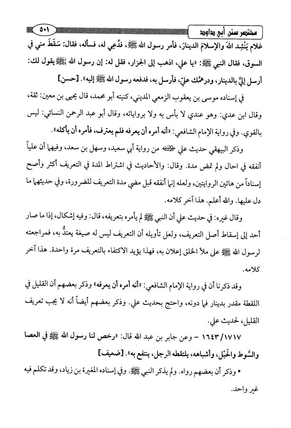 1717/ 1643 - وعن جابر بن عبد اللَّه قال: "رخص لنا رسول اللَّه -صلى اللَّه عليه وسلم- في العصا والسَّوط والحَبْل، وأشباهه، يلتقطه الرجل، ينتفع به".hضعيف]
