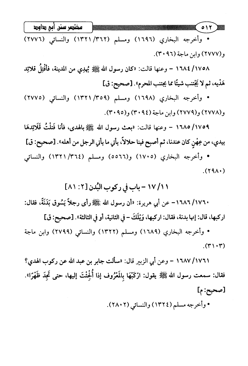 1760/ 1686 - عن أبي هريرة: "أن رسول اللَّه -صلى اللَّه عليه وسلم- رأى رجلًا يَسُوق بَدَنَةً، فقال: اركبها، قال: إنها بدنة، فقال: اركبها، ويْلَكَ -في الثانية، أو في الثالثة".hصحيح: ق]