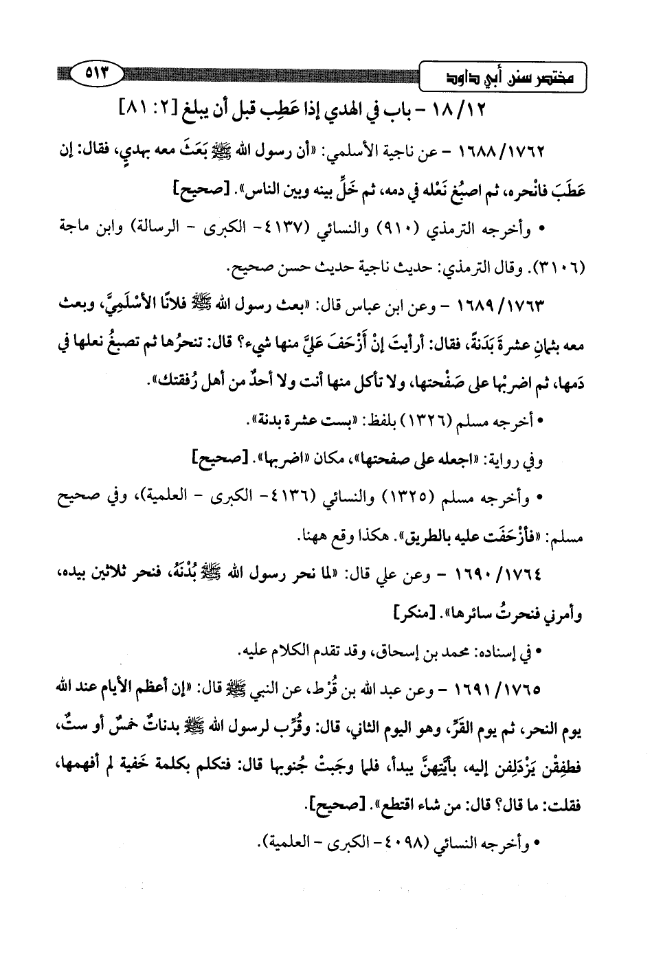 1763/ 1689 - وعن ابن عباس قال: "بعث رسول اللَّه -صلى اللَّه عليه وسلم- فلانًا الأسْلَمِيَّ، وبعث معه بثمانِ عشرةَ بَدَنةً، فقال: أرأيتَ إنْ أَزْحَفَ عَليَّ منها شيء؟ قال: تنحرُها ثم تصبغُ نعلها في دَمها، ثم اضربْها على صَفْحتها، ولا تأكل منها أنت ولا أحدٌ من أهل رُفقتك".