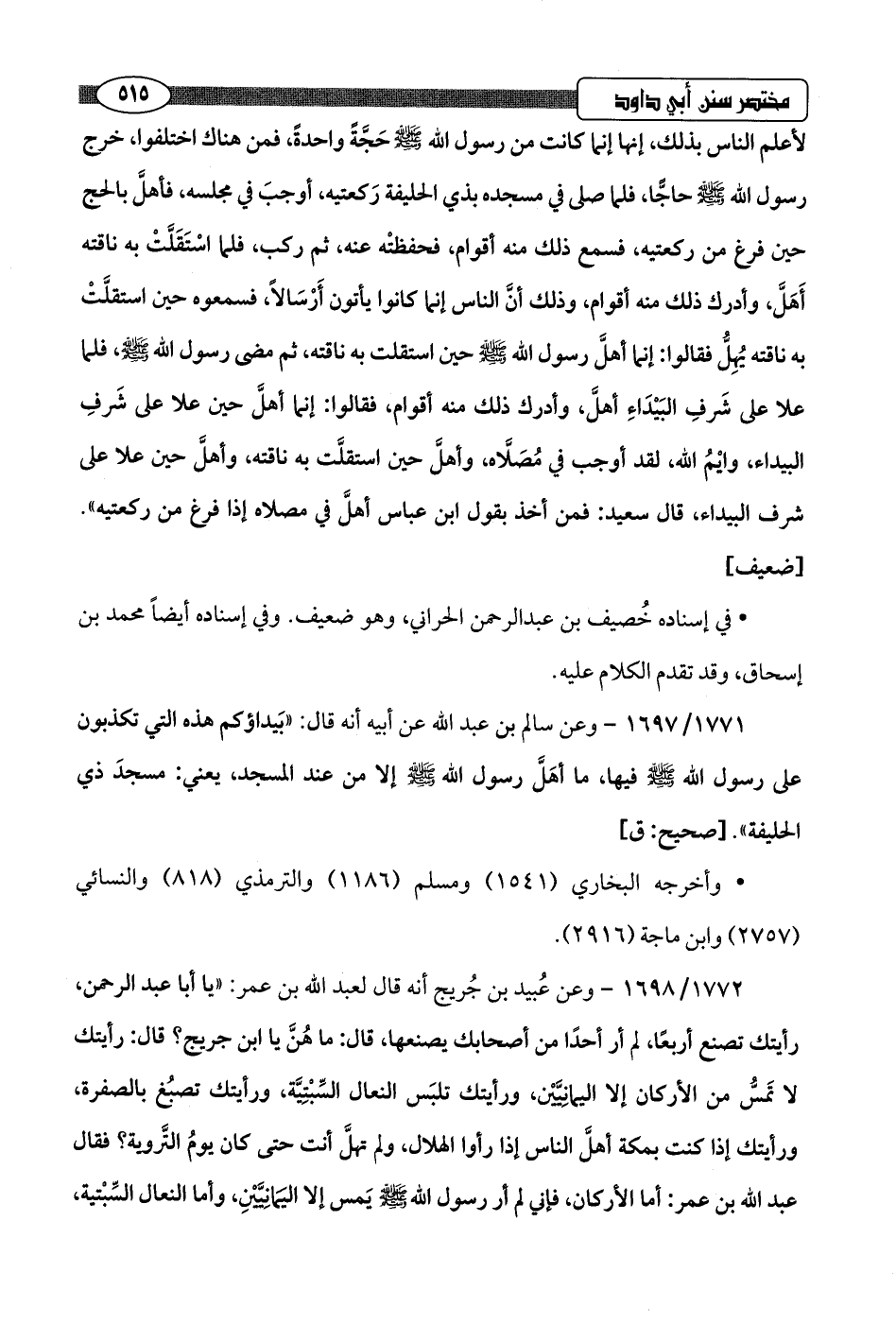 1771/ 1697 - وعن سالم بن عبد اللَّه عن أبيه أنه قال: "بَيداؤكم هذه التي تكذبون على رسول اللَّه -صلى اللَّه عليه وسلم- فيها، ما أهَلَّ رسول اللَّه -صلى اللَّه عليه وسلم- إلا من عند المسجد، يعني: مسجدَ ذي الحليفة".hصحيح: ق]