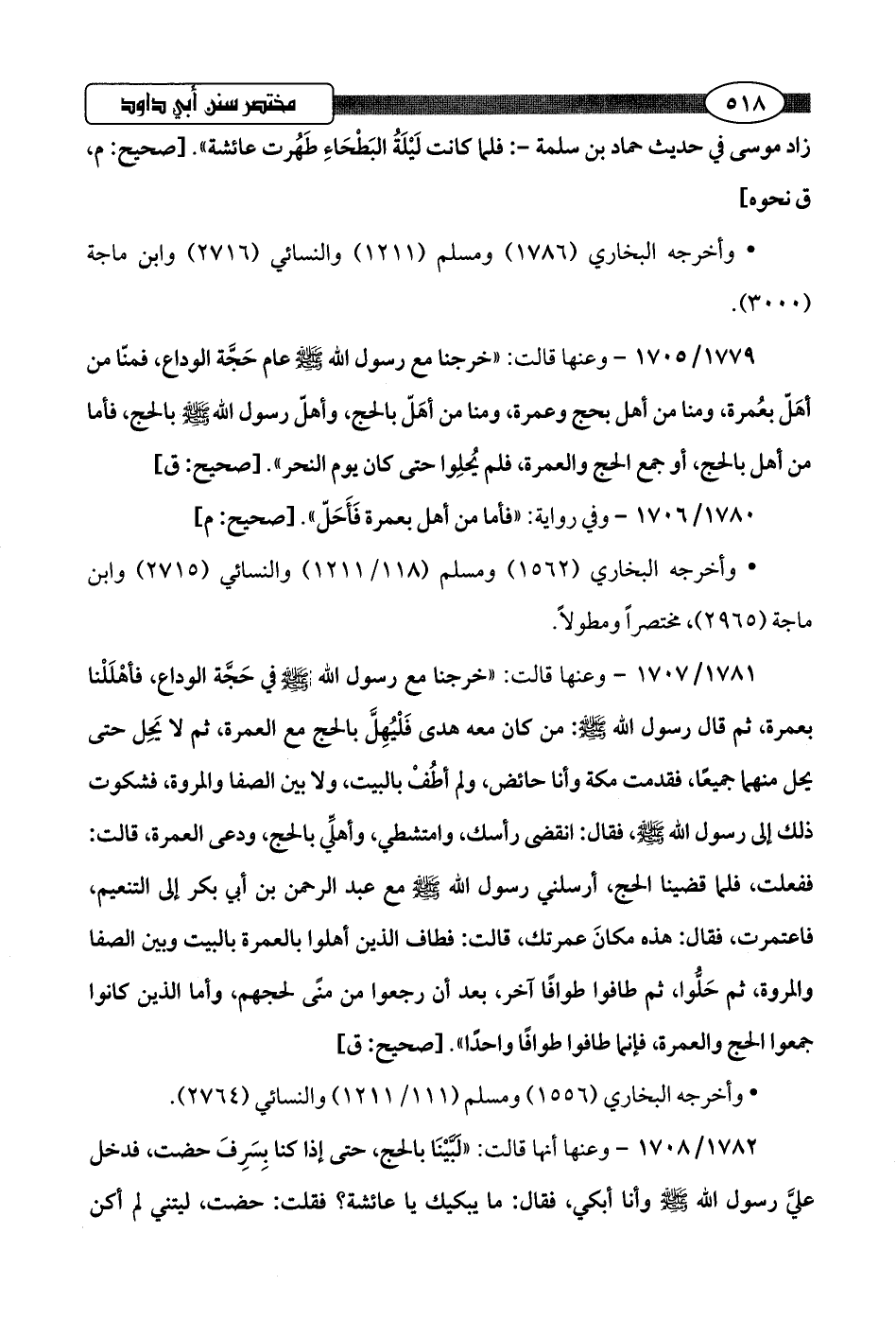 زاد موسى في حديث حماد بن سلمة-: فلما كانت لَيْلَةُ البَطْحَاءِ طَهُرت عائشة".hصحيح: م ق نحوه]