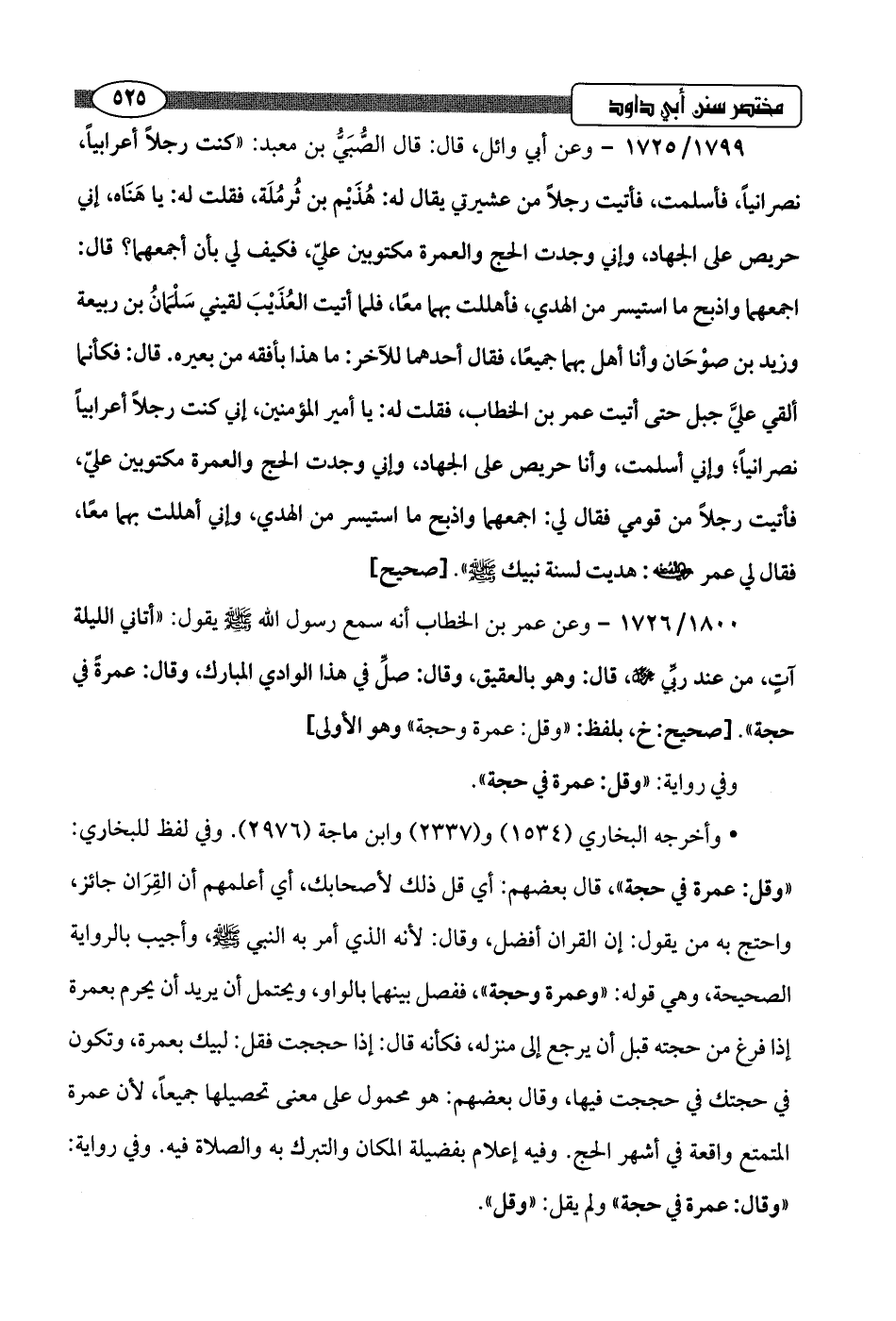 1799/ 1725 - وعن أبي وائل، قال: قال الصُّبَيُّ بن معبد: "كنت رجلًا أعرابيًا، نصرانيًا، فأسلمت، فأتيت رجلًا من عشيرتي يقال له: هُذَيْم بن ثُرمُلَة، فقلت له: يا هَنَاه، إني حريص على الجهاد، وإني وجدت الحج والعمرة مكتوبين عليّ، فكيف لي بأن أجعهما؟ قال: اجعهما واذبح ما استيسر من الهدي، فأهللت بهما معًا، فلما أتيت العُذَيْبَ لقيني سَلْمَانُ بن ربيعة وزيد بن صوْحَان وأنا أهل بهما جميعًا، فقال أحدهما للآخر: ما هذا بأفقه من بعيره. قال: فكأنما ألقي عليَّ جبل حتى أتيت عمر بن الخطاب، فقلت له: يا أمير المؤمنين، إني كنت رجلًا أعرابيًا نصرانيًا؛ وإني أسلمت، وأنا حريص على الجهاد، وإني وجدت الحج والعمرة مكتوبين عليّ، فأتيت رجلًا من قومي فقال لي: اجمعهما واذبح ما استيسر من الهدي، وإني أهللت بهما معًا، فقال لي عمر -رضي اللَّه عنه-: هديت لسنة نبيك -صلى اللَّه عليه وسلم-".hصحيح]