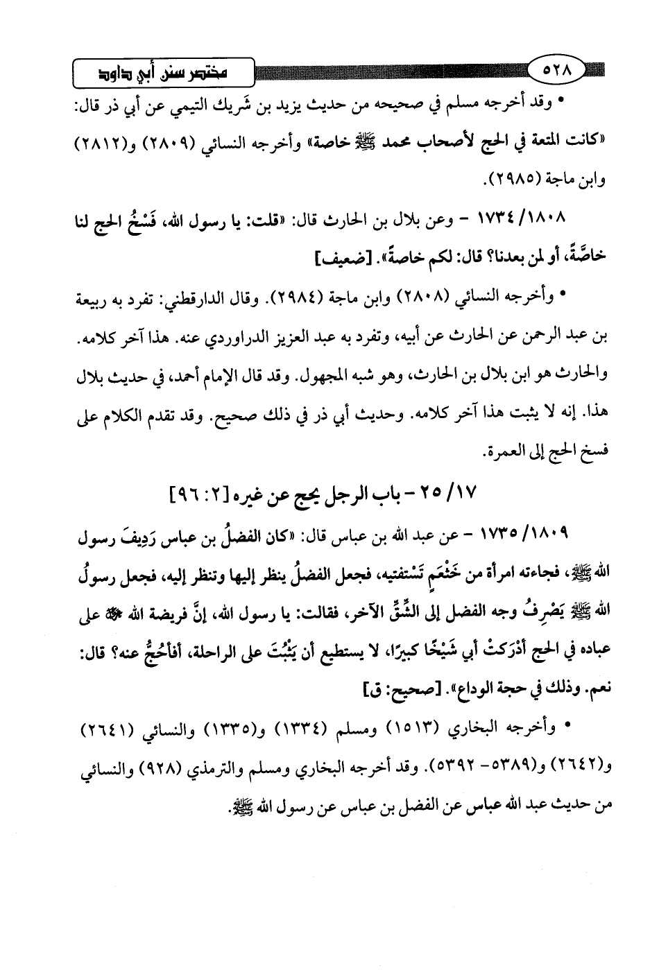 1808/ 1734 - وعن بلال بن الحارث قال: "قلت: يا رسول اللَّه، فَسْخُ الحج لنا خاصَّةً، أو لمن بعدنا؟ قال: لكم خاصةً".hضعيف]