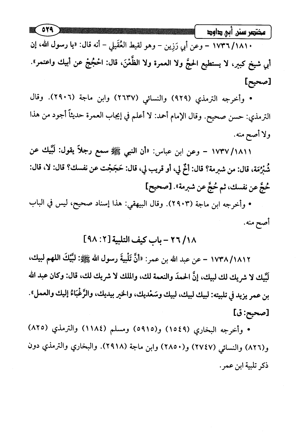 1810/ 1736 - وعن أبي رَزِين -وهو لقيط العُقَيلي- أنه قال: "يا رسول اللَّه، إن أبي شيخ كبير، لا يستطيع الحجَّ ولا العمرة ولا الظَّعْنَ، قال: احْجُجْ عن أبيك واعتمر".hصحيح]