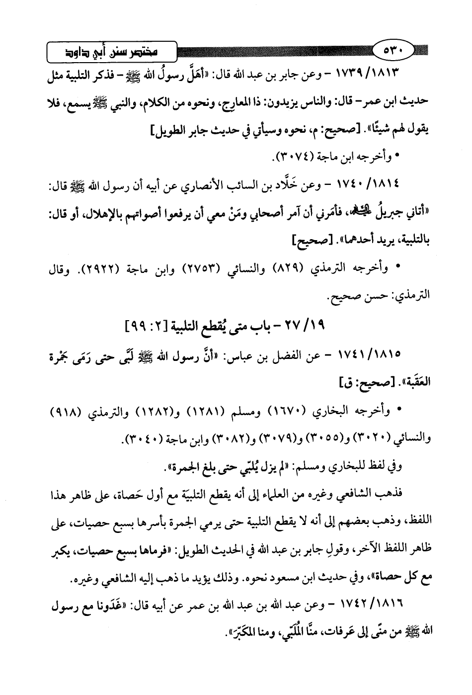 1815/ 1741 - عن الفضل بن عباس: "أنَّ رسول اللَّه -صلى اللَّه عليه وسلم- لَبَّى حتى رَمَى جَمْرة العَقَبة".hصحيح: ق]