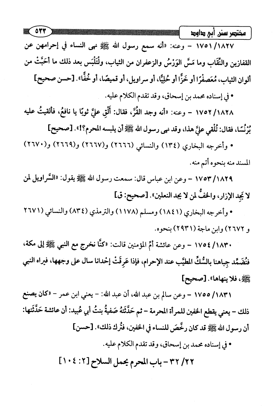 1831/ 1755 - وعن سالم بن عبد اللَّه، أن عبد اللَّه: -يعني ابن عمر- "كان يصنع ذلك -يعني يقطع الخفين للمرأة المحرمة- ثم حَدَّثَتهُ صَفيةُ بنتُ أبي عُبيد: أن عائشة حَدَّثَتها: أن رسول اللَّه -صلى اللَّه عليه وسلم- قد كان رخَّصَ للنساء في الخفين، فتُرك ذلك".hحسن]