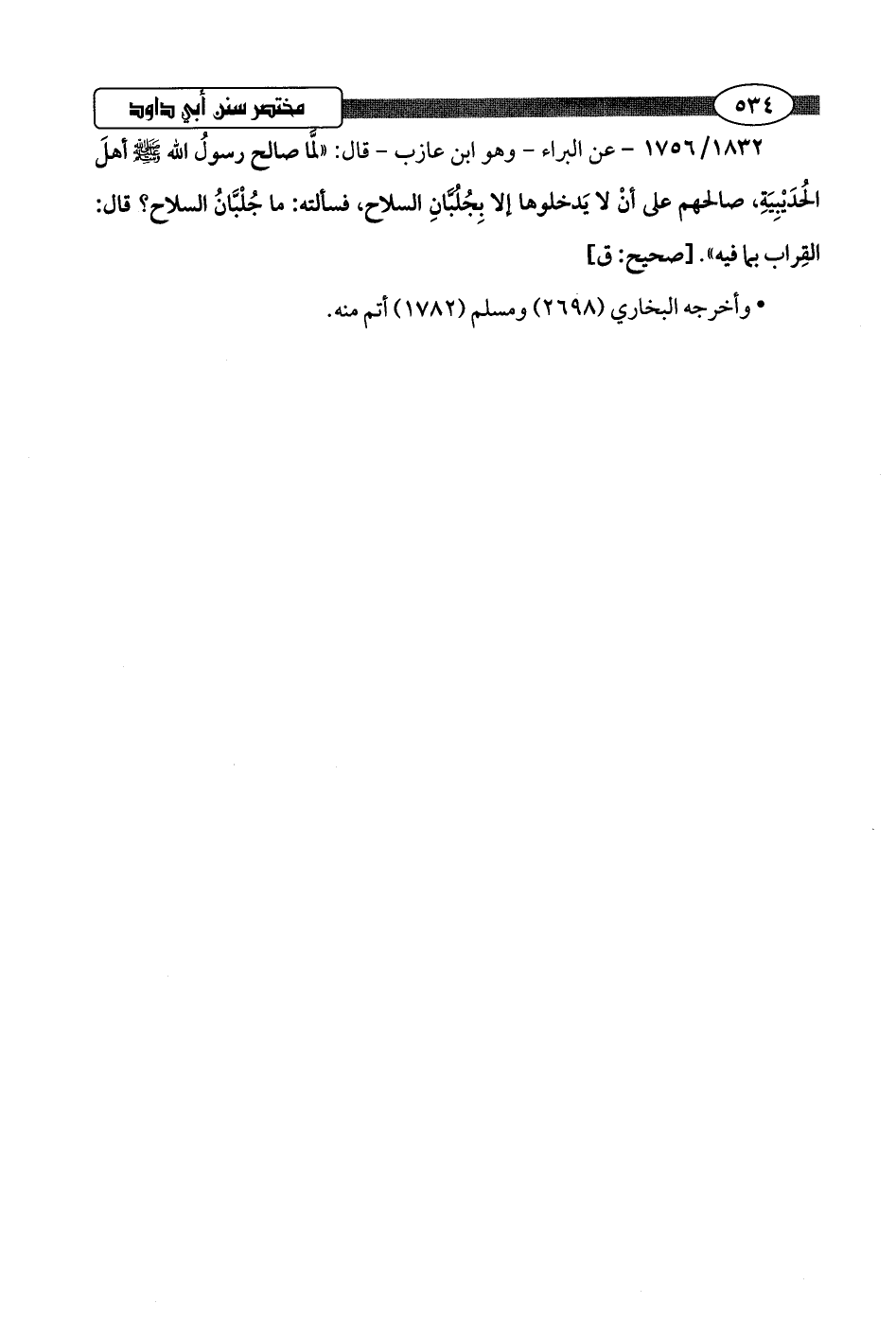 1832/ 1756 - عن البراء -وهو ابن عازب- قال: "لمَّا صالح رسولُ اللَّه -صلى اللَّه عليه وسلم- أهلَ الحُدَيْبِيَةِ، صالحهم على أنْ لا يَدخلوها إلا بِجُلُبَّانِ السلاح، فسألته: ما جُلْبَّانُ السلاح؟ قال: القِراب بما فيه".hصحيح: ق]