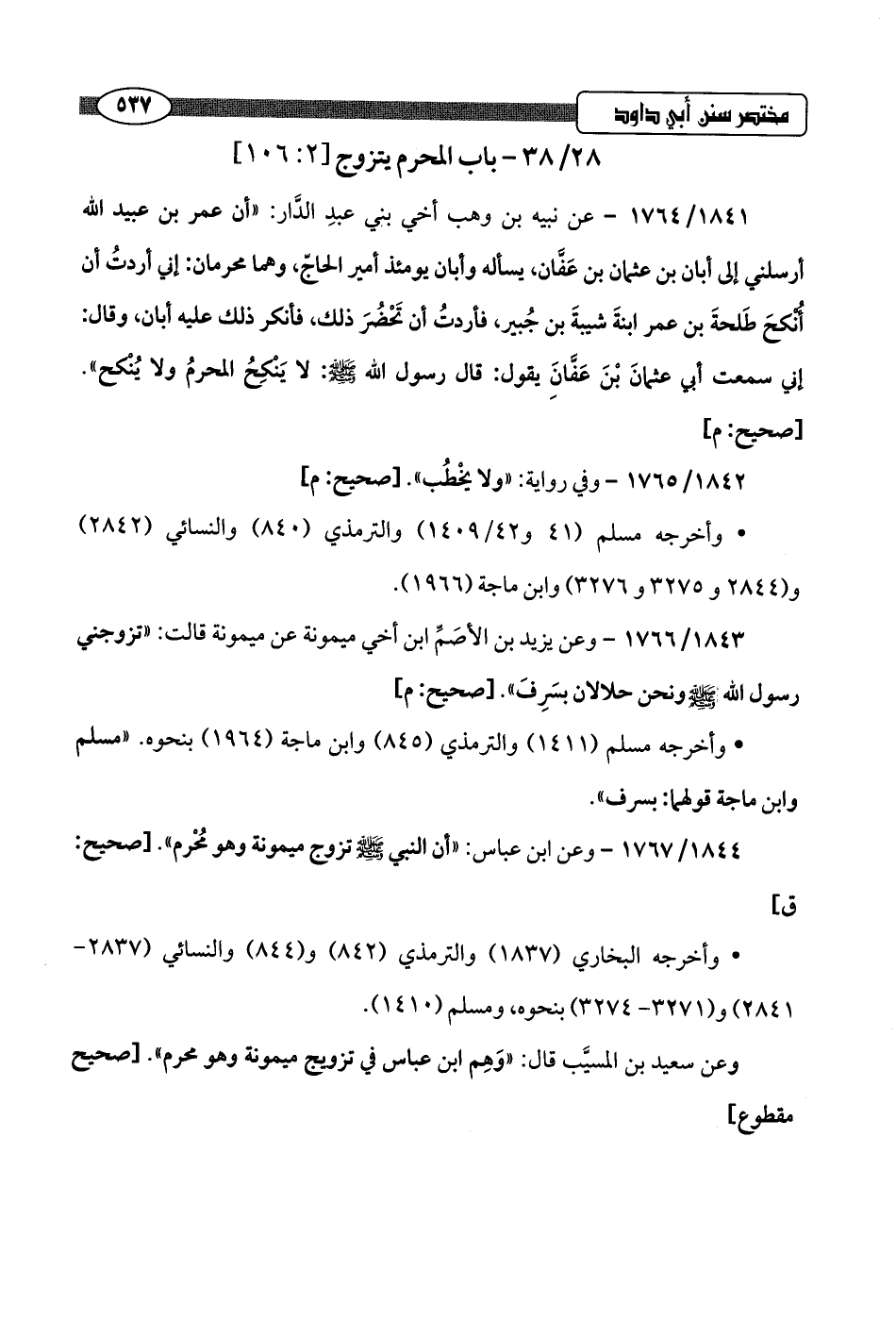 1841/ 1764 - عن نبيه بن وهب أخي بني عبدِ الدَّار: "أن عمر بن عبيد اللَّه أرسلني إلى أبان بن عثمان بن عَفَّان، يسأله وأبان يومئذ أمير الحاجّ، وهما محرمان: إني أردتُ أن أُنْكحَ طَلحةَ بن عمر ابنةَ شيبةَ بن جُبير، فأردتُ أن تَحْضُرَ ذلك، فأنكر ذلك عليه أبان، وقال: إني سمعت أبي عثمانَ بْنَ عَفَّانَ يقول: قال رسول اللَّه -صلى اللَّه عليه وسلم-: لا يَنْكِحُ المحرمُ ولا يُنْكح".hصحيح: م]