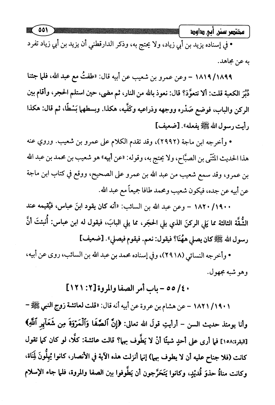 1901/ 1821 - عن هشام بن عروة عن أبيه أنه قال: "قلت لعائشة زوج النبي -صلى اللَّه عليه وسلم- وأنا يومئذٍ حديث السنن- أرأيتِ قولَ اللَّه تعالى: {إِنَّ الصَّفَا وَالْمَرْوَةَ مِنْ شَعَائِرِ اللَّهِ} [البقرة: 158] فما أرى على أحدٍ شيئًا أن لا يَطَّوف بهما؟ قالت عائشة: كلَّا، لو كان كما تقول كانت (فلا جناح عليه أن لا يطوف بهما) إنما أنزلت هذه الآية في الأنصار، كانوا يُهِلُّونَ لمِنَاة، وكانت مناةُ حذوَ قُديْدٍ، وكانوا يَتَحَرَّجون أن يَطَّوفوا بين الصفا والمروة، فلما جاء الإِسلام