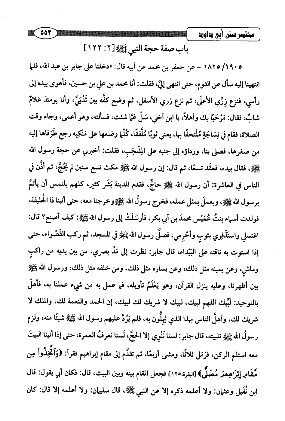 1905/ 1825 - عن جعفر بن محمَّد عن أبيه قال: "دخلنا على جابر بن عبد اللَّه، فلما انتهينا إليه سأل عن القوم، حتى انتهى إليَّ، فقلت: أنا محمد بن علي بن حسين، فأهوى بيده إلى رأسي، فنزع زِرِّي الأعلَى، ثم نزع زري الأسفل، ثم وضع كفَّه بين ثَدْيَيَّ، وأنا يومئذٍ غلامٌ شابٌ، فقال: مَرْحَبًا بك وأهلًا، يا ابن أخي، سَلْ عَمَّا شئت، فسألته، وهو أعمى، وجاء وقت الصلاة، فقام في نِسَاجَةٍ مُلْتحفًا بها، يعني ثويًا مُلَّفقًا، كُلّما وضعها على مَنْكِبه رجع طَرَفاها إليه من صغرها، فصلى بنا، ورداؤه إلى جنبه على المِشْجَبِ، فقلت: أخبرني عن حجة رسول اللَّه -صلى اللَّه عليه وسلم-، فقال بيده، فعقَد تسعًا، ثم قال: إن رسول اللَّه -صلى اللَّه عليه وسلم- مكث تسع سنين لم يَحُجَّ، ثم أذَّن في الناس في العاشرة: أن رسول اللَّه -صلى اللَّه عليه وسلم- حاجٌّ، فقدم المدينة بَشَر كثير، كلهم يلتمس أن يأتمَّ برسول اللَّه -صلى اللَّه عليه وسلم-، ويعملَ بمثل عمله، فخرج رسولُ اللَّه -صلى اللَّه عليه وسلم- وخرجنا معه، حتى أتينا ذا الحُليفة، فولدت أسماء بنتُ عُمَيْس محمدَ بن أبي بكر، فأرسَلَتْ إلى رسول اللَّه -صلى اللَّه عليه وسلم-: كيف أصنع؟ قال: اغتسلي واستَذْفِري بثوبٍ وأحْرِمي، فصلَّى رسول اللَّه -صلى اللَّه عليه وسلم- في المسجد، ثم ركب القَصْواء، حتى إذا استوت به ناقته على البَيْداء، قال جابر: نظرت إلى مَدِّ بصري، من بين يديه من راكبٍ وماشٍ، وعن يمينه مثل ذلك، وعن يساره مثل ذلك، ومن خلفه مثل ذلك، ورسول اللَّه -صلى اللَّه عليه وسلم- بين أظهرنا، وعليه ينزل القرآن، وهو يَعْلَمُ تأويله، فما عمل به من شيء عملنا به، فأهلّ بالتوحيد: لَبَّيك اللهم لبيك، لبيك لا شريك لك لبيك، إن الحمد والنعمة لك، والملك لا شريك لك، وأهلَّ الناس بهذا الذي يُهِلُّون به، فلم يَرُدَّ عليهم رسول اللَّه -صلى اللَّه عليه وسلم- شيئًا منه، ولزم رسولُ اللَّه -صلى اللَّه عليه وسلم- تلبيته، قال جابر: لسنا نَنْوِي إلا الحجَّ، لَسنا نعرفُ العمرة، حتى إذا أتينا البيتَ معه استلم الركن، فرَمَل ثلاثًا، ومشى أربعًا، ثم تقدَّم إلى مقام إبراهيم فقرأ: {وَاتَّخِذُوا مِنْ مَقَامِ إِبْرَاهِيمَ مُصَلًّى} [البقرة: 125] فجعل المقام بينه وبين البيت، قال: فكان أبي يقول: قال ابن نُفَيل وعثمان: ولا أعلمه ذكره إلا عن النبي -صلى اللَّه عليه وسلم-، قال سليمان: ولا أعلمه إلا قال: كان
