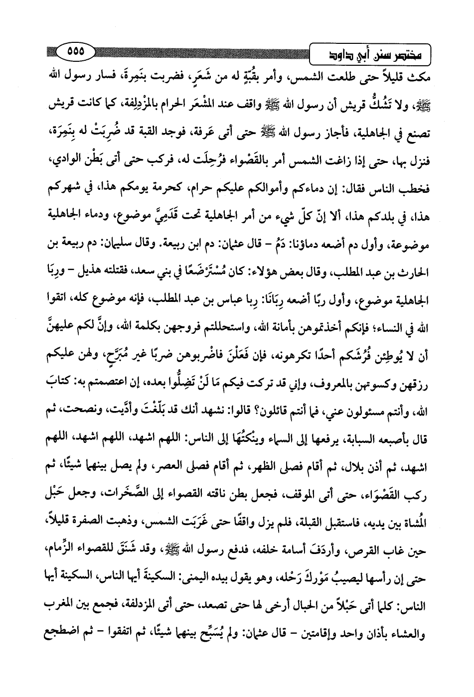 مكث قليلًا حتى طلعت الشمس، وأمر بقُبّةٍ له من شَعَرٍ، فضربت بنَمِرةَ، فسار رسول اللَّه -صلى اللَّه عليه وسلم-، ولا تَشُكُّ قريش أن رسول اللَّه -صلى اللَّه عليه وسلم- واقف عند المشْعَر الحرام بالمزْدِلِفة، كما كانت قريش تصنع في الجاهلية، فأجاز رسول اللَّه -صلى اللَّه عليه وسلم- حتى أتى عَرفة، فوجد القبة قد ضُرِبَتْ له بِنَمِرَة، فنزل بها، حتى إذا زاغت الشمس أمر بالقَصْواء فرُحِلَت له، فركب حتى أتى بَطْن الوادي، فخطب الناس فقال: إن دماءكم وأموالكم عليكم حرام، كحرمة يومكم هذا، في شهركم هذا، في بلدكم هذا، ألا إنّ كلّ شيء من أمر الجاهلية تحت قَدَمِيَّ موضوع، ودماء الجاهلية موضوعة، وأول دم أخرجه دماؤنا: دَمُ -قال عثمان: دم ابن ربيعة. وقال سليمان: دم ربيعة بن الحارث بن عبد المطلب، وقال بعض هؤلاء: كان مُسْتَرضَعًا في بني سعد، فقتلته هذيل- ورِبَا الجاهلية موضوع، وأول ربًا أضعه رِبَانَا: رِبا عباس بن عبد المطلب، فإنه موضوع كله، اتقوا اللَّه في النساء؛ فإنكم أخذتموهن بأمانة اللَّه، واستحللتم فروجهن بكلمة اللَّه، وإنَّ لكم عليهنَّ أن لا يُوطِئن فُرُشَكم أحدًا تكرهونه، فإن فَعَلْنَ فاضْربوهن ضربًا غير مُبَرَّحٍ، ولهن عليكم رزقهن وكسوتهن بالمعروف، وإني قد تركت فيكم مَا لَنْ تَضِلُّوا بعده، إن اعتصمتم به: كتابَ اللَّه، وأنتم مسئولون عني، فما أنتم قائلون؟ قالوا: نشهد أنك قد بَلّغْتَ وأدَّيت، ونصحت، ثم قال بأصبعه السبابة، يرفعها إلى السماء وينْكتُهَا إلى الناس: اللَّهم اشهد، اللَّهم اشهد، اللَّهم اشهد، ثم أذن بلال، ثم أقام فصلى الظهر، ثم أقام فصلى العصر، ولم يصل بينهما شيئًا، ثم ركب القَصْوَاء، حتى أتى الموقف، فجعل بطن ناقته القصواء إلى الصَّخَرات، وجعل حَبْل المُشاة بين يديه، فاستقبل القبلة، فلم يزل واقفًا حتى غَرَبَت الشمس، وذهبت الصفرة قليلًا، حين غاب القرص، وأردَفَ أسامة خلفه، فدفع رسول اللَّه -صلى اللَّه عليه وسلم-، وقد شَنَقَ للقصواء الزِّمام، حتى إن رأسها ليصيبُ مَوْركَ رَحْله، وهو يقول بيده اليمنى: السكينةَ أيها الناس، السكينة أيها الناس: كما أتى حَبْلًا من الحبال أرخى لها حتى تصعد، حتى أتى المزدلفة، فجمع بين المغرب والعشاء بأذان واحد وإقامتين -قال عثمان: ولم يُسَبِّح بينهما شيئًا، ثم اتفقوا- ثم اضطجع