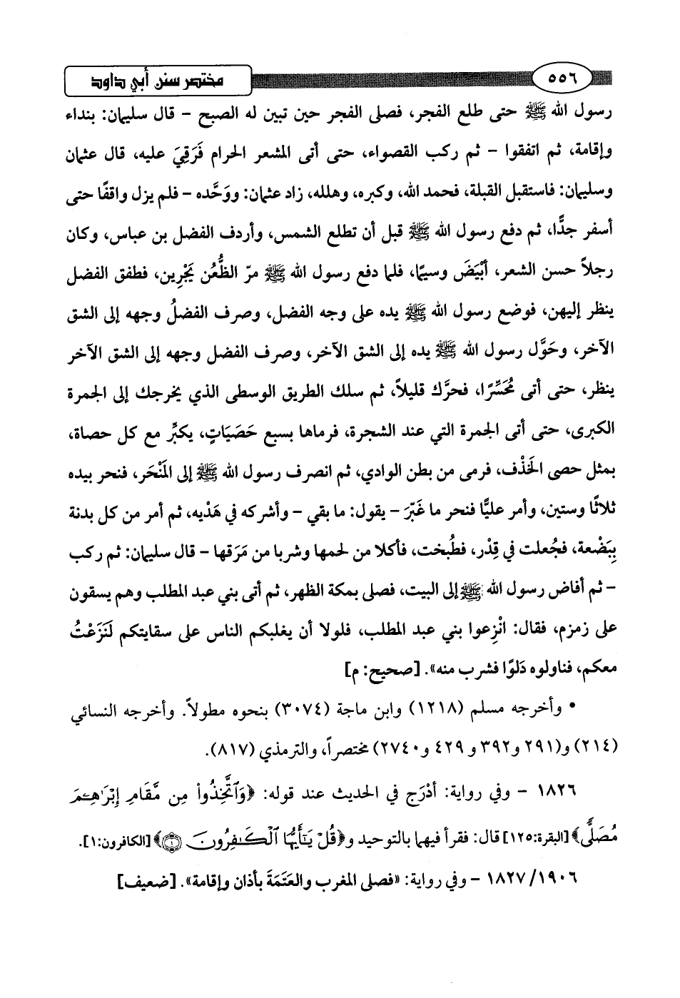 رسول اللَّه -صلى اللَّه عليه وسلم- حتى طلع الفجر، فصلى الفجر حين تبيّن له الصبح- قال سليمان: بنداء وإقامة، ثم اتفقوا- ثم ركب القصواء، حتى أتى المشعر الحرام فَرَقيَ عليه، قال عثمان وسليمان: فاستقبل القبلة، فحمد اللَّه، وكبره، وهلله، زاد عثمان: ووَحَّده- فلم يزل واقفًا حتى أسفر جدًّا، ثم دفع رسول اللَّه -صلى اللَّه عليه وسلم- قبل أن تطلع الشمس، وأردف الفضل بن عباس، وكان رجلًا حسن الشعر، أبْيَضَ وسيمًا، فلما دفع رسول اللَّه -صلى اللَّه عليه وسلم- مرّ الظُّعُن يَجْرِين، فطفق الفضل ينظر إليهن، فوضع رسول اللَّه -صلى اللَّه عليه وسلم- يده على وجه الفضل، وصرف الفضلُ وجهه إلى الشق الآخر، وحَوَّل رسول اللَّه -صلى اللَّه عليه وسلم- يده إلى الشق الآخر، وصرف الفضل وجهه إلى الشق الآخر ينظر، حتى أتى مُحَسِّرًا، فحرَّك قليلًا، ثم سلك الطَّريق الوسطى الذي يخرجك إلى الجمرة الكبرى، حتى أتى الجمرة التي عند الشجرة، فرماها بسبع حَصَيَاتٍ، يكبِّر مع كل حصاة، بمثل حصى الخَذْف، فرمى من بطن الوادي، ثم انصرف رسول اللَّه -صلى اللَّه عليه وسلم- إلى المَنْحَر، فنحر بيده ثلاثًا وستين، وأمر عليًّا فنحر ما غبّرَ -يقول: ما بقي- وأشركه في هَدْيه، ثم أمر من كل بدنة بِبَضْعة، فجُعلت في قِدْر، فطُبخت، فأكلا من لحمها وشربا من مَرَقها -قال سليمان: ثم ركب- ثم أفاض رسول اللَّه -صلى اللَّه عليه وسلم- إلى البيت، فصلى بمكة الظهر، ثم أتى بني عبد المطلب وهم يسقون على زمزم، فقال: انْزِعوا بني عبد المطلب، فلولا أن يغلبكم الناس على سقايتكم لنَزَعْتُ معكم، فناولوه دَلوًا فشرب منه".hصحيح: م]