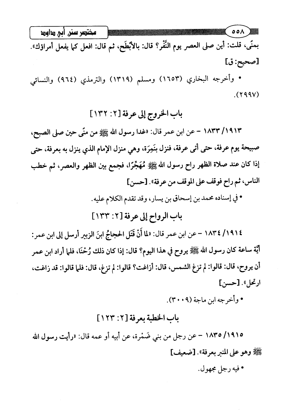 1913/ 1833 - عن ابن عمر قال: "غدا رسول اللَّه -صلى اللَّه عليه وسلم- من منًى حين صلى الصبح، صبيحة يوم عرفة، حتى أتى عرفة، فنزل بنَمِرَة، وهي منزل الإمام الذي ينزل به بعرفة، حتى إذا كان عند صلاة الظهر راح رسول اللَّه -صلى اللَّه عليه وسلم- مُهَجِّرًا، فجمع بين الظهر والعصر، ثم خطب الناس، ثم راح فوقف على الموقف من عرفة".hحسن]