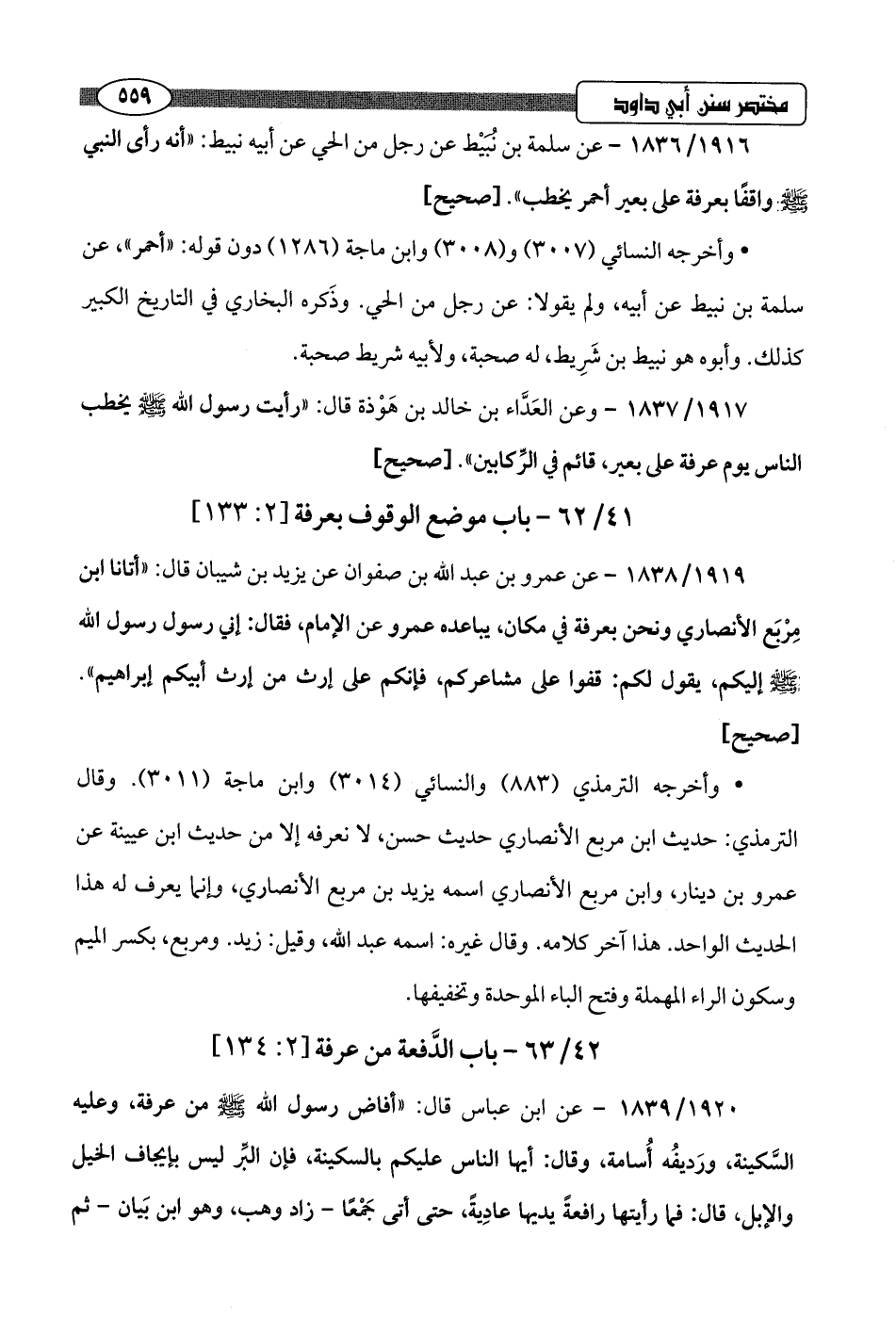 1916/ 1836 - عن سلمة بن نُبَيْط عن رجل من الحي عن أبيه نبيط: "أنه رأى النبي -صلى اللَّه عليه وسلم- واقفًا بعرفة على بعير أحمر يخطب".hصحيح]