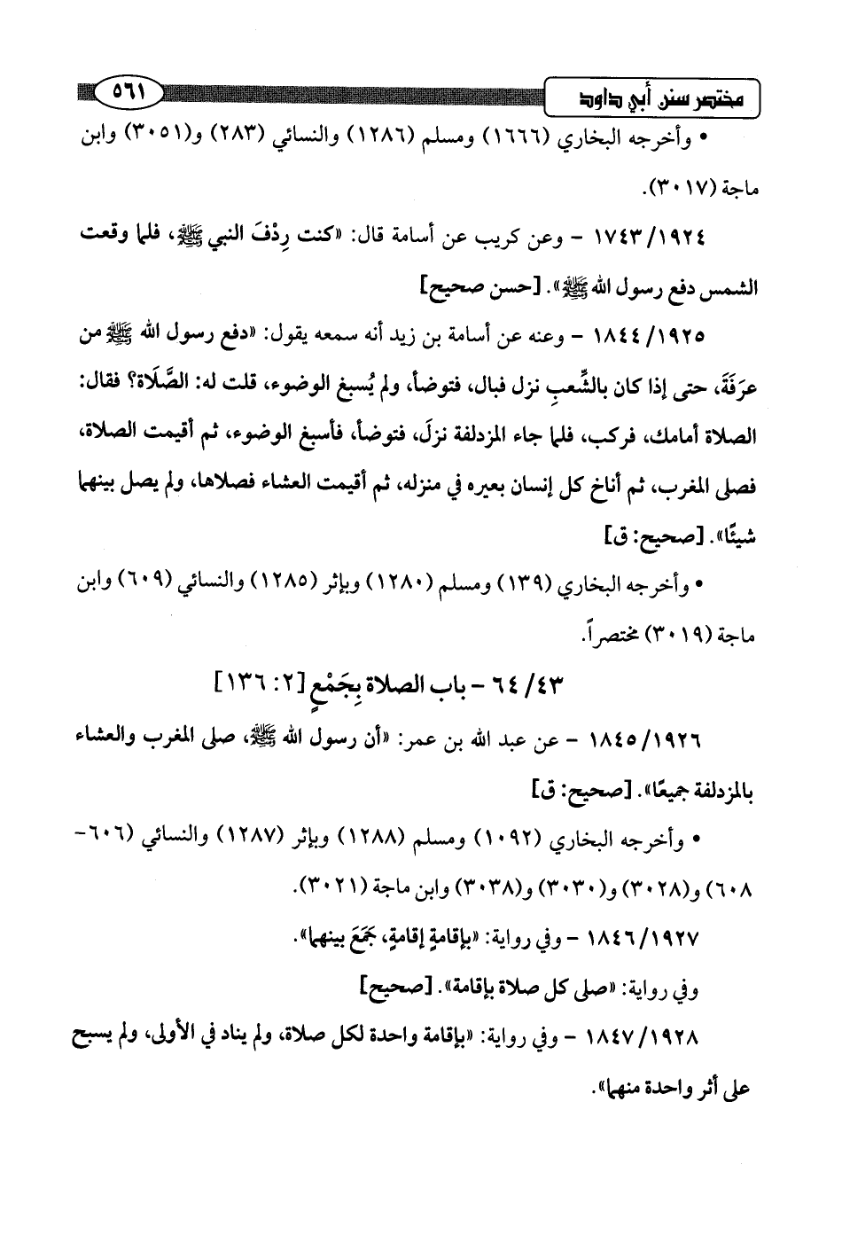 1926/ 1845 - عن عبد اللَّه بن عمر: "أن رسول اللَّه -صلى اللَّه عليه وسلم-، صلى المغرب والعشاء بالمزدلفة جميعًا".hصحيح: ق]