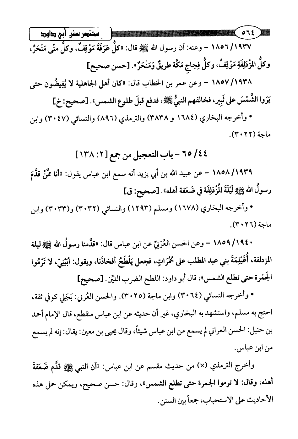 1940/ 1859 - وعن الحسن العُرَنِيِّ عن ابن عباس قال: "قدَّمنا رسولُ اللَّه -صلى اللَّه عليه وسلم- ليلة المزدلفة، أُغَيْلِمَةَ بني عبد المطلب على حُمُرَاتٍ، فجعل يَلْطَحُ أفخاذَنا، ويقول: أبَيْنيّ، لا تَرْمُوا الجَمْرة حتى تطلع الشمس"، قال أبو داود: اللطح الضرب الليِّن.hصحيح]