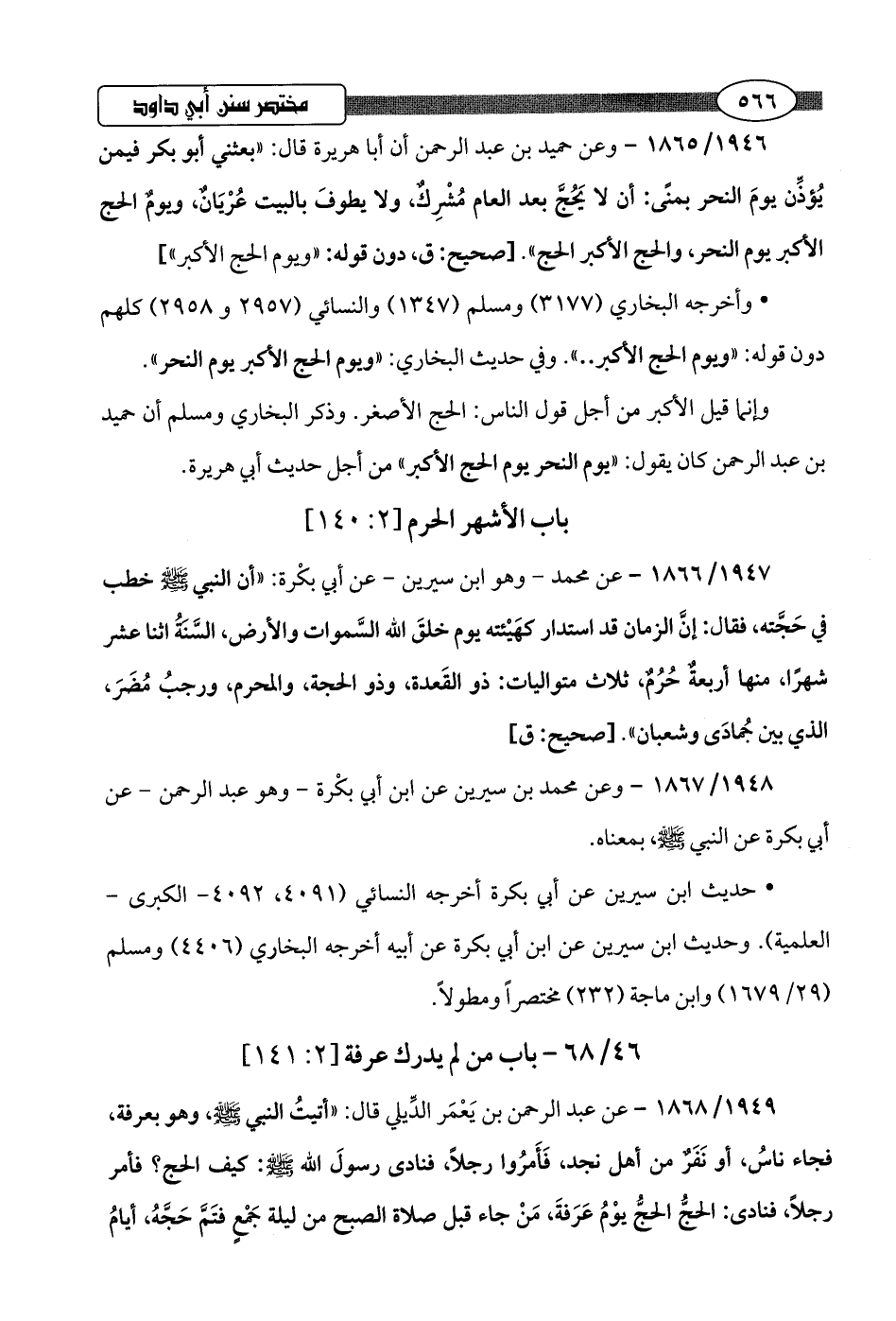 1946/ 1865 - وعن حميد بن عبد الرحمن أن أبا هريرة قال: "بعثني أبو بكر فيمن يُؤذِّن يومَ النحر بمنًى: أن لا يَحُجَّ بعد العام مُشْرِكٌ، ولا يطوفَ بالبيت عُرْيَان، ويومٌ الحج الأكبر يوم النحر، والحج الأكبر الحج".hصحيح: ق، دون قوله: "ويوم الحج الأكبر"]