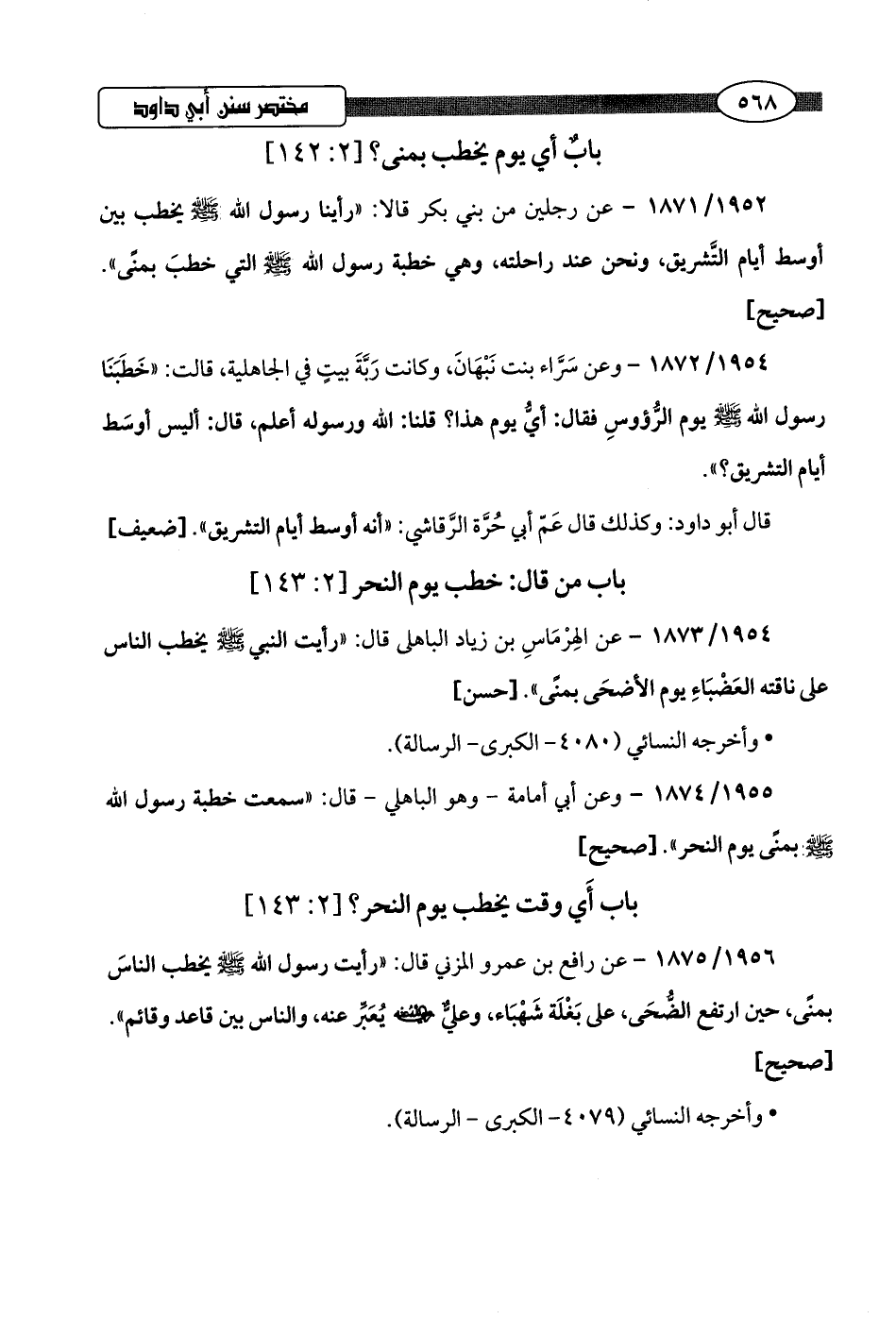 1953/ 1872 - وعن سَرَّاء بنت نَبْهَانَ، وكانت رَبَّةَ بيتِ في الجاهلية، قالت: "خَطَبَنَا رسول اللَّه -صلى اللَّه عليه وسلم- يوم الرُّؤوسِ فقال: أيُّ يوم هذا؟ قلنا: اللَّه ورسوله أعلم، قال: أليس أوسَط أيَّام التشريق؟ ".