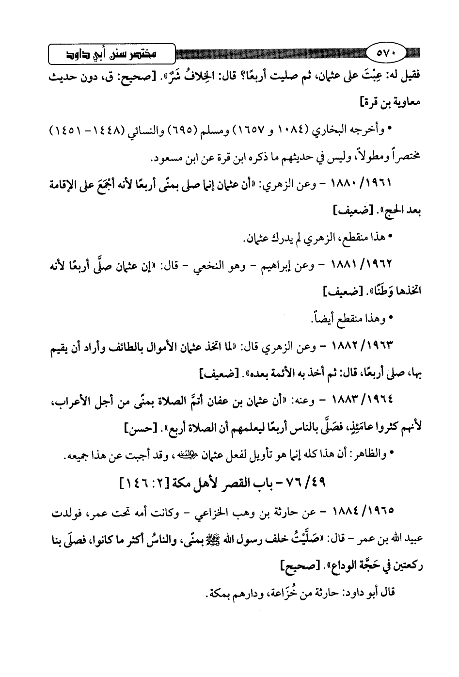 1962/ 1881 - وعن إبراهيم -وهو النخعي- قال: "إن عثمان صلَّى أربعًا لأنه اتخذها وَطَنًا".hضعيف]