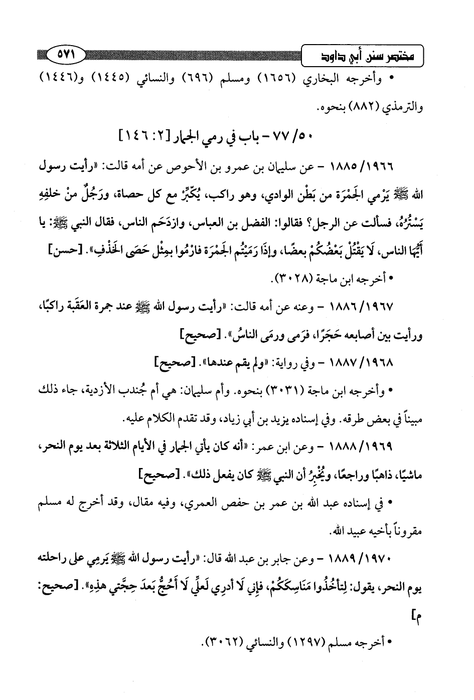 1966/ 1885 - عن سليمان بن عمرو بن الأحوص عن أمه قالت: "رأيت رسول اللَّه -صلى اللَّه عليه وسلم- يَرْمي الجَمْرَة من بَطْن الوادي، وهو راكب، يُكّبِّرْ مع كل حصاة، ورَجُلٌ منْ خلفِهِ يَسْتُرُهُ، فسألت عن الرجل؟ فقالوا: الفضل بن العباس، وازدَحَم الناس، فقال النبي -صلى اللَّه عليه وسلم-: يا أيُّها الناس، لَا يَقْتُلْ بَعْضُكُم بعضًا، وإذَا رَمَيْتُم الجَمْرَة فارْمُوا بمِثْل حَصَى الخَذْفِ".hحسن]
