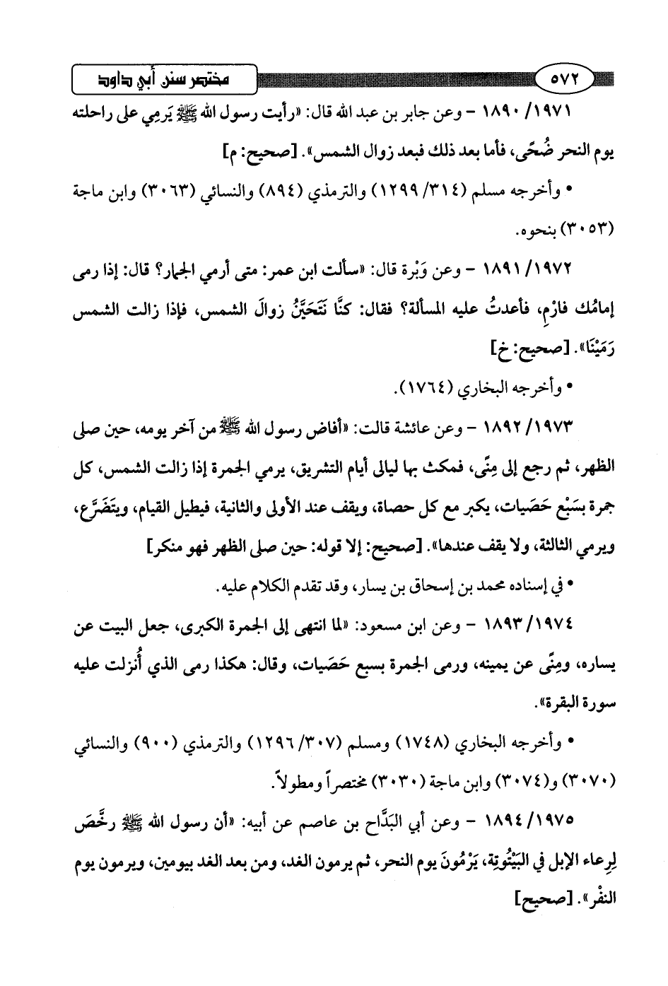 1971/ 1890 - وعن جابر بن عبد اللَّه قال: "رأيت رسول اللَّه -صلى اللَّه عليه وسلم- يَرمِي على راحلته يوم النحر ضُحًى، فأمَّا بعد ذلك فبعد زوال الشمس".hصحيح: م]