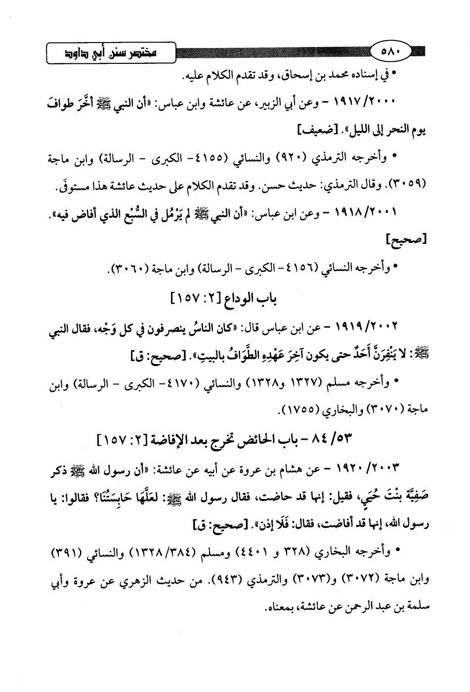 2000/ 1917 - وعن أبي الزبير، عن عائشة وابن عباس: "أن النبي -صلى اللَّه عليه وسلم- أخَّرَ طوافَ يوم النحر إلى الليل".hضعيف]