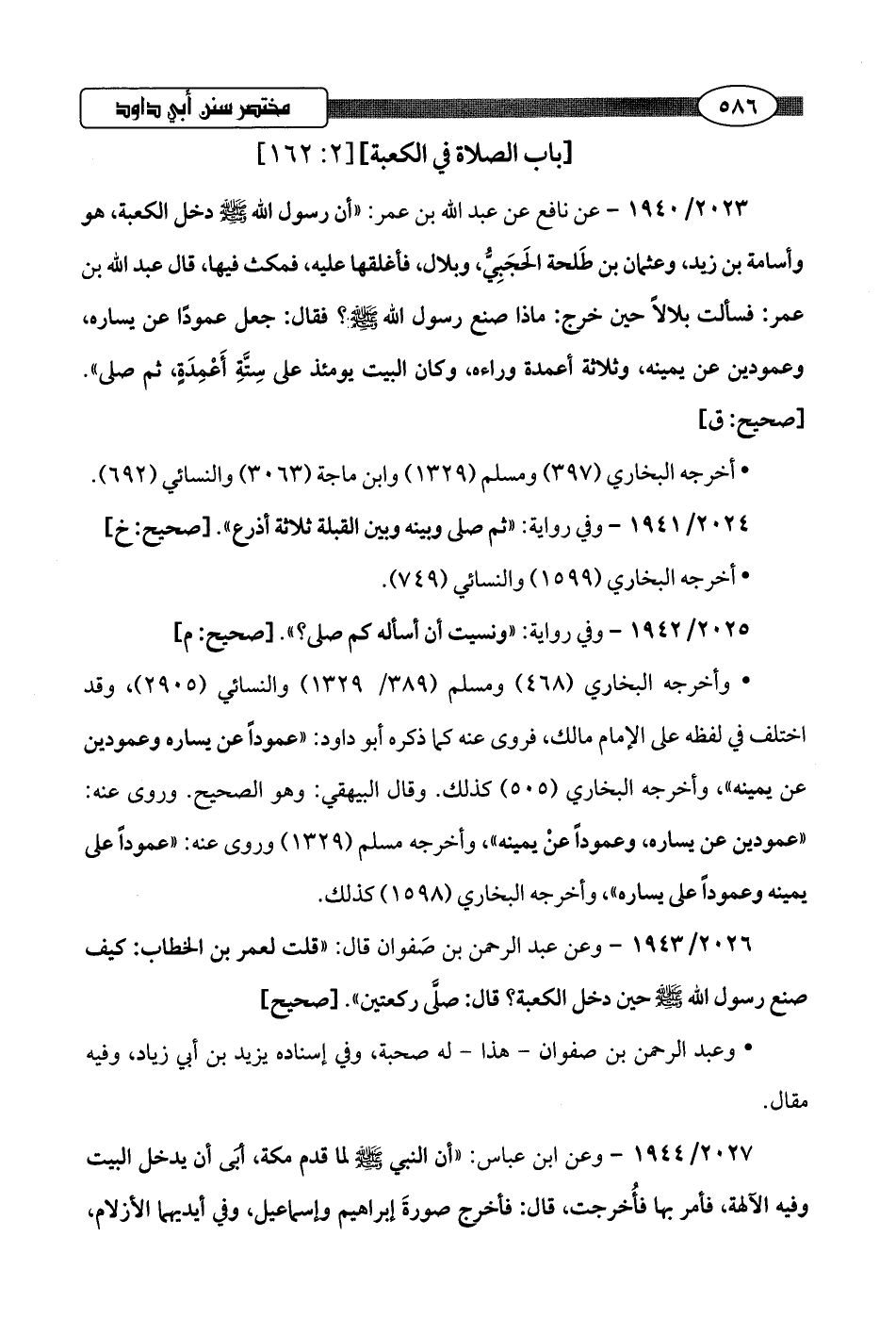 2023/ 1940 - عن نافع عن عبد اللَّه بن عمر: "أن رسول اللَّه -صلى اللَّه عليه وسلم- دخل الكعبة، هو وأسامة بن زيد، وعثمان بن طَلحة الحَجَبِيُّ، وبلال، فأغلقها عليه، فمكث فيها، قال عبد اللَّه بن عمر: فسألت بلالًا حين خرج: ماذا صنع رسول اللَّه -صلى اللَّه عليه وسلم-؟ فقال: جعل عمودًا عن يساره، وعمودين عن يمينه، وثلاثة أعمدة وراءه، وكان البيت يومئذٍ على سِتَّةِ أَعْمِدَةٍ، ثم صلى".hصحيح: ق]