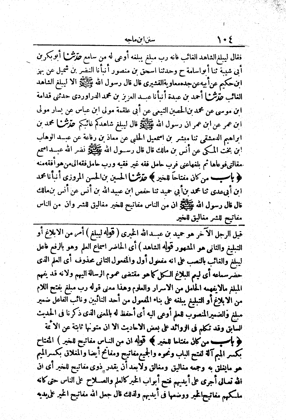قِيلَ الرَّجُلُ الْآخَرُ هُوَ حُمَيْدُ بْنُ عَبْدِ اللَّهِ الْخَيْرِيُّ قَوْلُهُ (لِيُبَلِّغِ) أَمْرٌ مِنَ الْإِبْلَاغِ أَوِ التَّبْلِيغِ وَالثَّانِي هُوَ الْمَشْهُورُ قَوْلُهُ (الشَّاهِدُ) أَيِ الْحَاضِرُ إِسْمَاعَ الْعِلْمِ وَهُوَ بِالرَّفْعِ فَاعِلٌ لِيُبَلِّغَ وَالْغَائِبَ بِالنَّصْبِ عَلَى أَنَّهُ مَفْعُولٌ أَوَّلٌ وَالْمَفْعُولُ الثَّانِي مَحْذُوفٌ أَيِ الْعِلْمُ الَّذِي حَضَرَ سَمَاعَهُ أَيْ لِيَعُمَّ الْبَلَاغُ الْكُلَّ كَمَا هُوَ مُقْتَضَى عُمُومِ الرِّسَالَةِ إِلَيْهِمْ وَلِأَنَّهُ قَدْ يَفْهَمُ الْمُبَلَّغُ مَا لَا يَفْهَمُهُ الْحَامِلُ مِنَ الْأَسْرَارِ وَالْعُلُومِ وَهَذَا مَعْنَى قَوْلِهِ رُبَّ مُبَلَّغٍ بِفَتْحِ اللَّامِ مِنَ الْإِبْلَاغِ أَوِ التَّبْلِيغِ يُبَلِّغُهُ عَلَى بِنَاءِ الْمَفْعُولِ مِنْ أَحَدِ النَّائِبِينَ وَنَائِبُ الْفَاعِلِ ضَمِيرُ مُبَلَّغٍ وَالضَّمِيرُ الْمَنْصُوبُ لِلْعِلْمِ أَوْعَى إِلَيْهِ أَيْ أَحْفَظُ لَهُ بِالْمَعْنَى الَّذِي ذَكَرْنَا فِي الْحَدِيثِ السَّابِقِ وَقَدْ تَكَلَّمَ فِي الزَّوَائِدِ عَلَى بَعْضِ الْأَحَادِيثِ إِلَّا أَنَّ مُتُونَهَا ثَابِتَةٌ عَنِ الْأَئِمَّةِ.