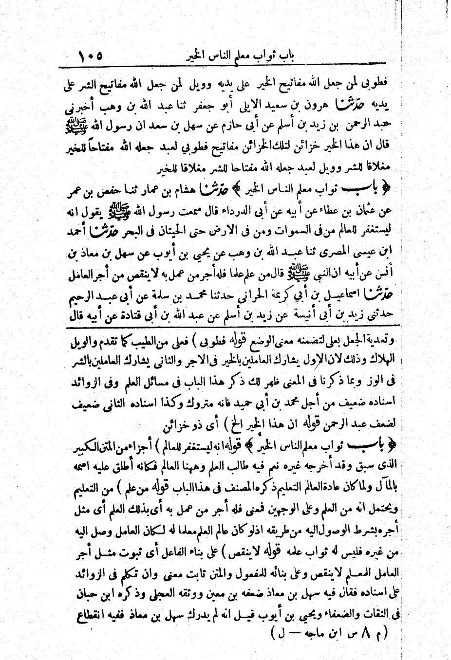 وَتَعْدِيَةُ الْجَعْلِ بِعَلَى لِتَضَمُّنِهِ مَعْنَى الْوَضْعِ قَوْلُهُ (فَطُوبَى) فُعْلَى مِنَ الطِّيبِ كَمَا تَقَدَّمَ وَالْوَيْلُ الْهَلَاكُ وَذَلِكَ لِأَنَّ الْأَوَّلَ يُشَارِكُ الْعَامِلِينَ بِالْخَيْرِ فِي الْأَجْرِ وَالثَّانِيَ يُشَارِكُ الْعَامِلِينَ بِالشَّرِّ فِي الْوِزْرِ وَبِمَا ذَكَرْنَا فِي الْمَعْنَى ظَهَرَ لَكَ ذِكْرُ هَذَا الْبَابِ فِي مَسَائِلِ الْعِلْمِ وَفِي الزَّوَائِدِ إِسْنَادُهُ ضَعِيفٌ مِنْ أَجْلِ مُحَمَّدِ بْنِ أَبِي حُمَيْدٍ فَإِنَّهُ مَتْرُوكٌ وَكَذَا إِسْنَادُهُ الثَّانِي ضَعِيفٌ لِضَعْفِ عَبْدِ الرَّحْمَنِ.