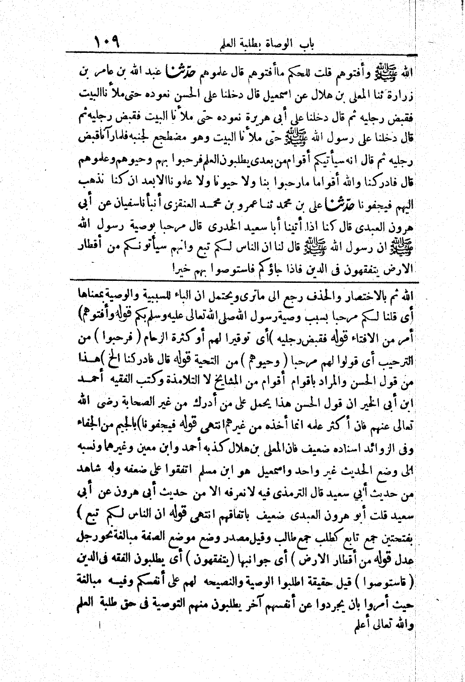 248 - حَدَّثَنَا عَبْدُ اللَّهِ بْنُ عَامِرِ بْنِ زُرَارَةَ حَدَّثَنَا الْمُعَلَّى بْنُ هِلَالٍ عَنْ إِسْمَعِيلَ قَالَ «دَخَلْنَا عَلَى الْحَسَنِ نَعُودُهُ حَتَّى مَلَأْنَا الْبَيْتَ فَقَبَضَ رِجْلَيْهِ ثُمَّ قَالَ دَخَلْنَا عَلَى أَبِي هُرَيْرَةَ نَعُودُهُ حَتَّى مَلَأْنَا الْبَيْتَ فَقَبَضَ رِجْلَيْهِ ثُمَّ قَالَ دَخَلْنَا عَلَى رَسُولِ اللَّهِ صَلَّى اللَّهُ عَلَيْهِ وَسَلَّمَ حَتَّى مَلَأْنَا الْبَيْتَ وَهُوَ مُضْطَجِعٌ لِجَنْبِهِ فَلَمَّا رَآنَا قَبَضَ رِجْلَيْهِ ثُمَّ قَالَ إِنَّهُ سَيَأْتِيكُمْ أَقْوَامٌ مِنْ بَعْدِي يَطْلُبُونَ الْعِلْمَ فَرَحِّبُوا بِهِمْ وَحَيُّوهُمْ وَعَلِّمُوهُمْ قَالَ فَأَدْرَكْنَا وَاللَّهِ أَقْوَامًا مَا رَحَّبُوا بِنَا وَلَا حَيَّوْنَا وَلَا عَلَّمُونَا إِلَّا بَعْدَ أَنْ كُنَّا نَذْهَبُ إِلَيْهِمْ فَيَجْفُونَا»