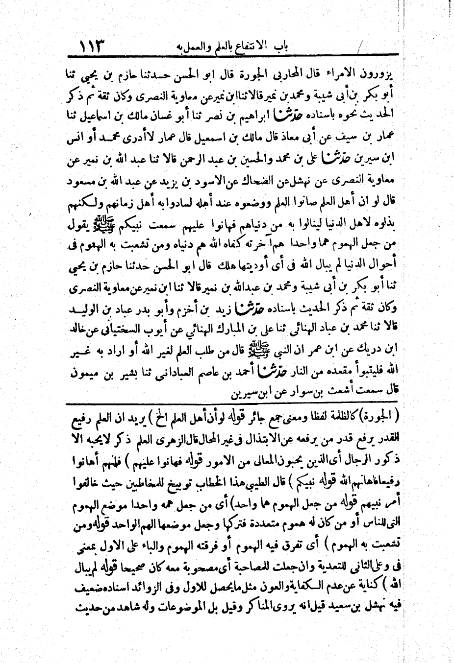 257 - حَدَّثَنَا عَلِيُّ بْنُ مُحَمَّدٍ وَالْحُسَيْنُ بْنُ عَبْدِ الرَّحْمَنِ قَالَا حَدَّثَنَا عَبْدُ اللَّهِ بْنُ نُمَيْرٍ عَنْ مُعَاوِيَةَ النَّصْرِيِّ عَنْ نَهْشَلٍ عَنْ الضَّحَّاكِ عَنْ الْأَسْوَدِ بْنِ يَزِيدَ عَنْ عَبْدِ اللَّهِ بْنِ مَسْعُودٍ قَالَ «لَوْ أَنَّ أَهْلَ الْعِلْمِ صَانُوا الْعِلْمَ وَوَضَعُوهُ عِنْدَ أَهْلِهِ لَسَادُوا بِهِ أَهْلَ زَمَانِهِمْ وَلَكِنَّهُمْ بَذَلُوهُ لِأَهْلِ الدُّنْيَا لِيَنَالُوا بِهِ مِنْ دُنْيَاهُمْ فَهَانُوا عَلَيْهِمْ سَمِعْتُ نَبِيَّكُمْ صَلَّى اللَّهُ عَلَيْهِ وَسَلَّمَ يَقُولُ مَنْ جَعَلَ الْهُمُومَ هَمًّا وَاحِدًا هَمَّ آخِرَتِهِ كَفَاهُ اللَّهُ هَمَّ دُنْيَاهُ وَمَنْ تَشَعَّبَتْ بِهِ الْهُمُومُ فِي أَحْوَالِ الدُّنْيَا لَمْ يُبَالِ اللَّهُ فِي أَيِّ أَوْدِيَتِهَا هَلَكَ»